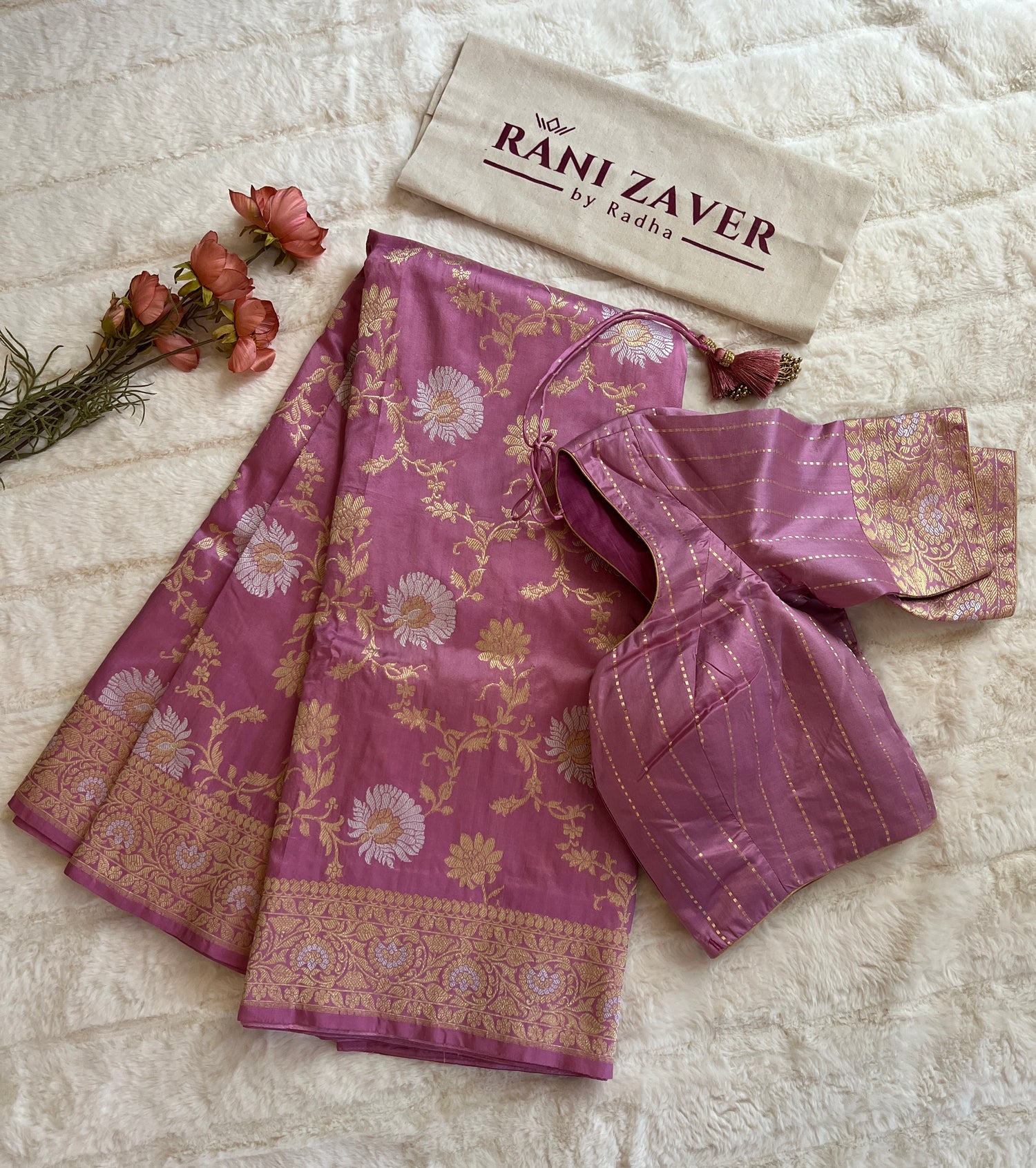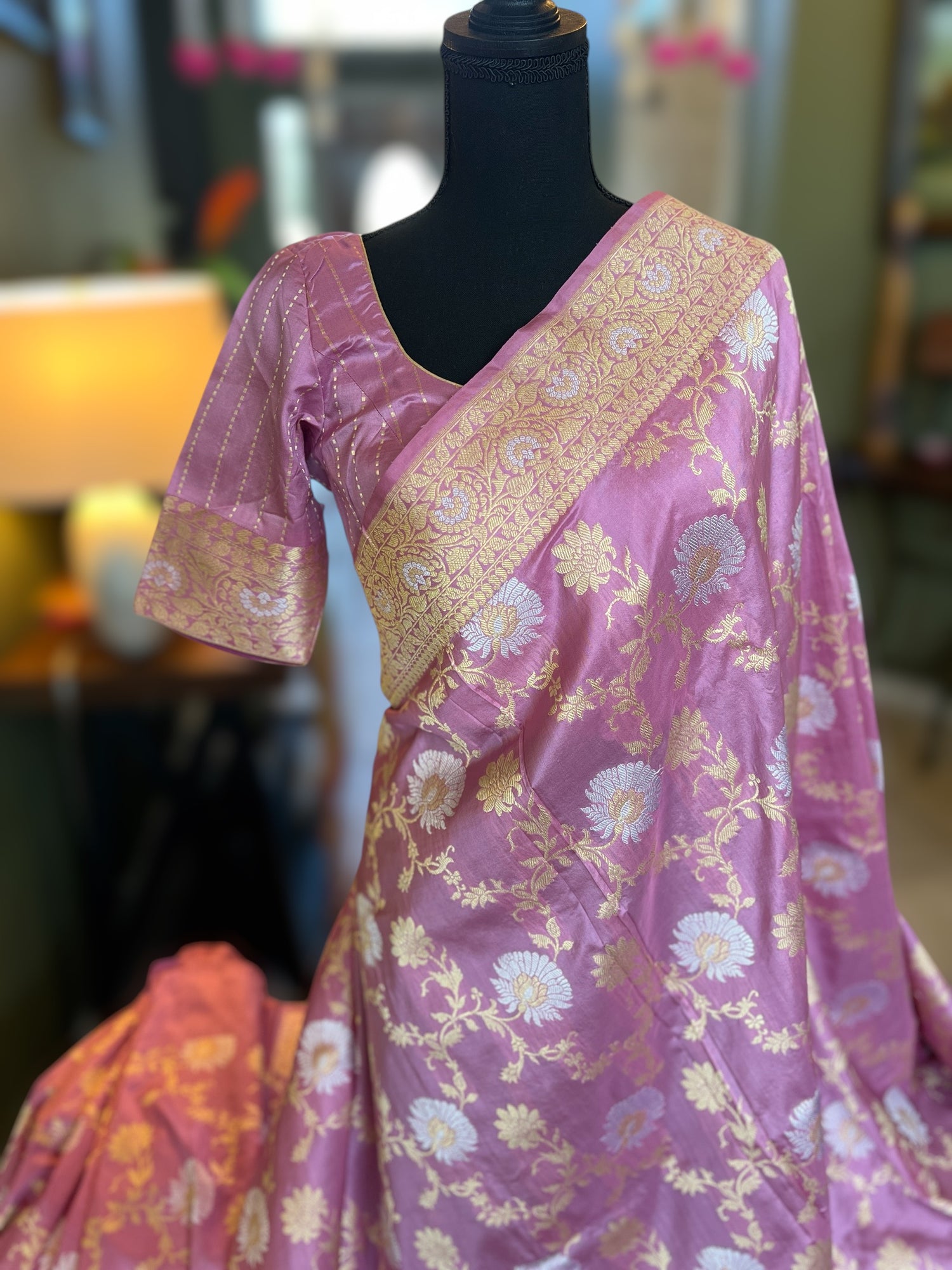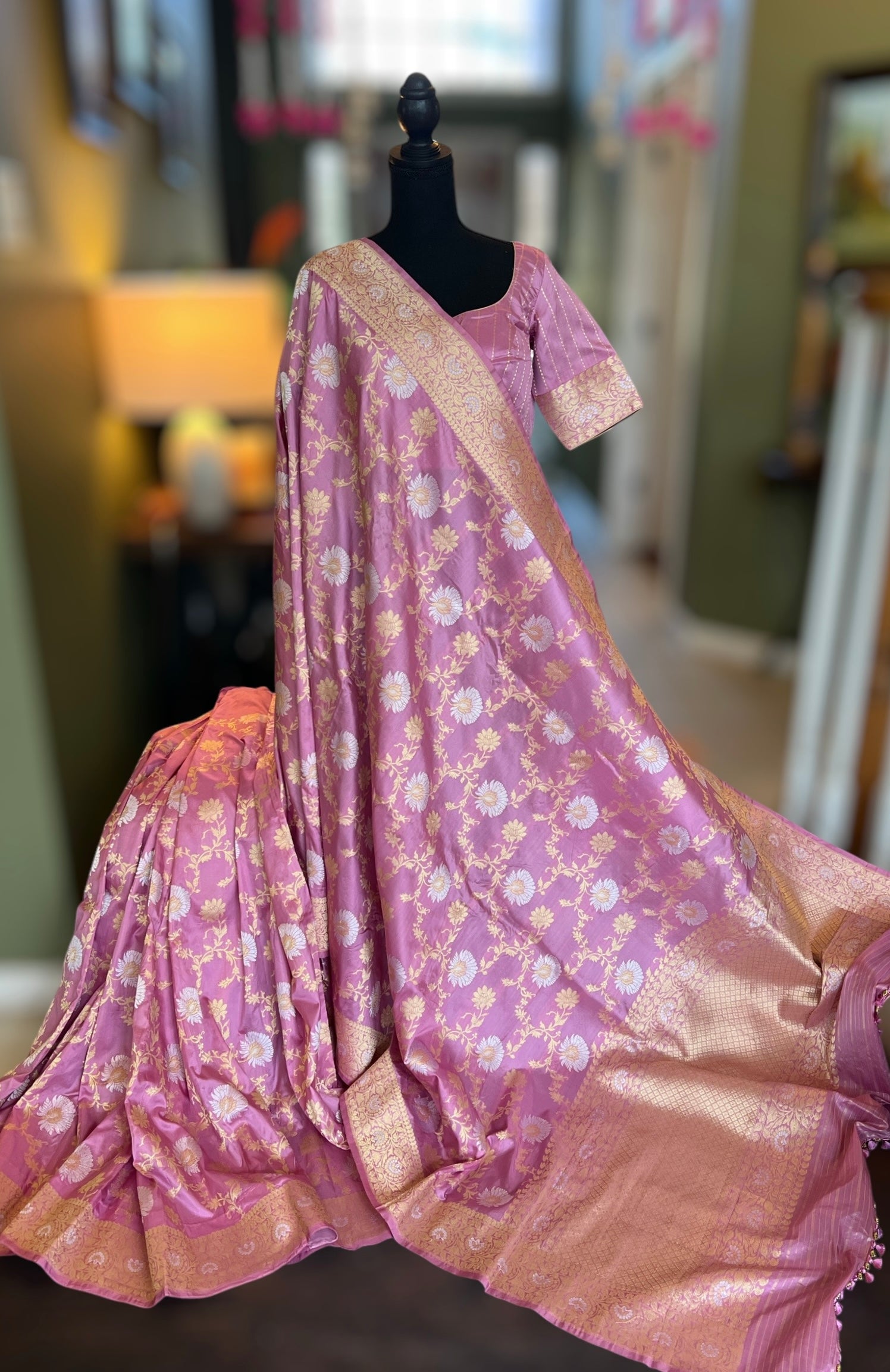 Banaras Handloom Katan Pure Silk KADUWA Floral Jaal With Pre-Stitched Blouse