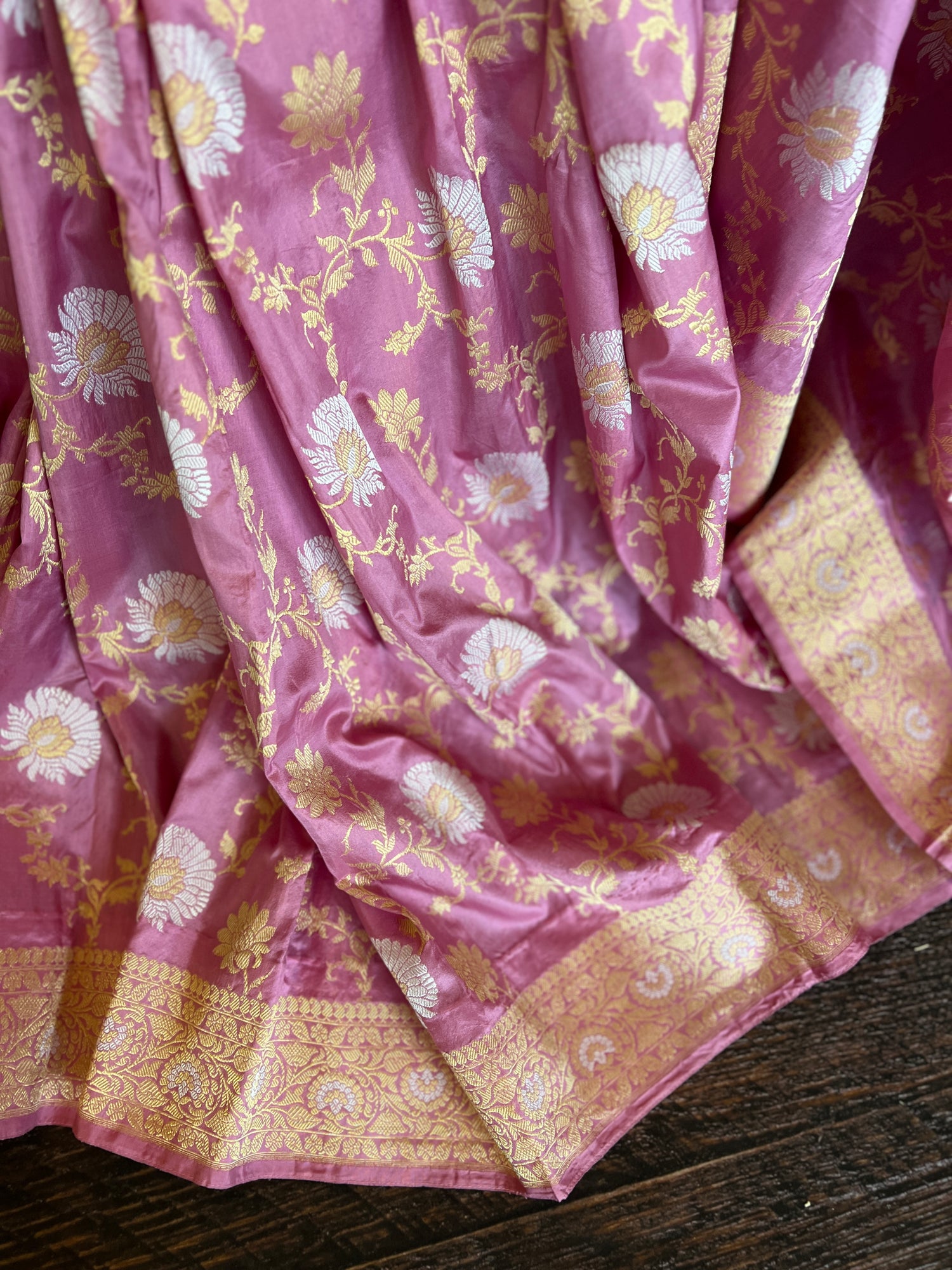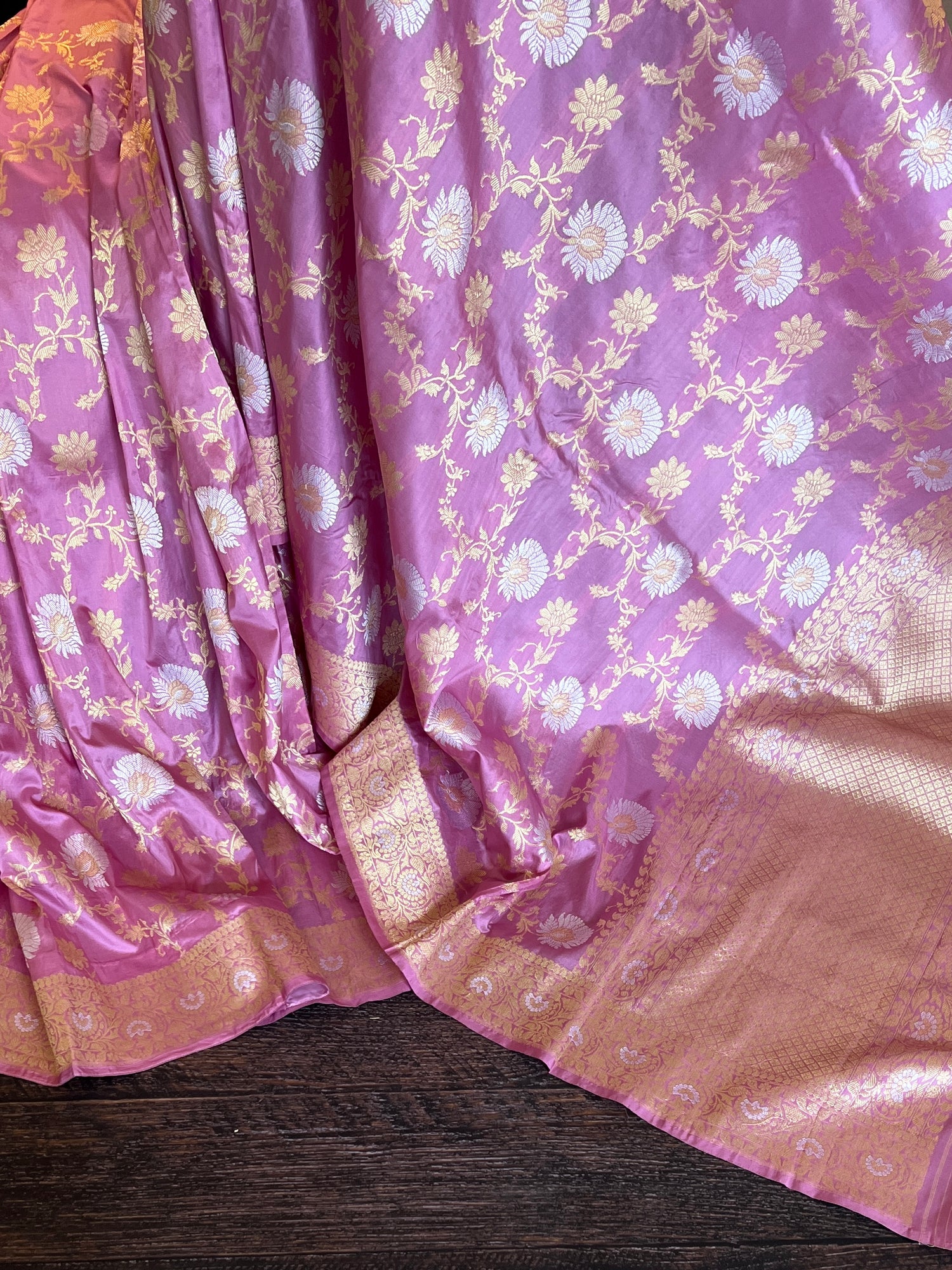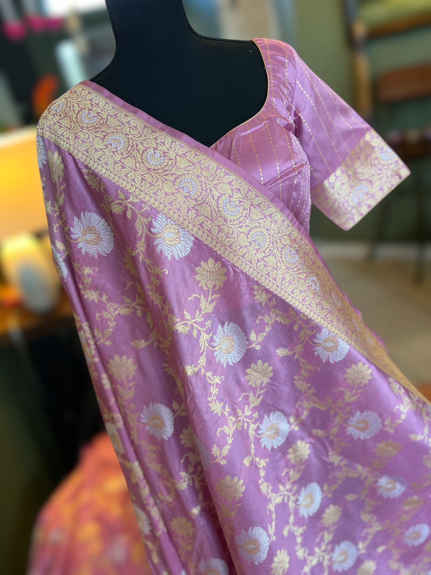 Banaras Handloom Katan Pure Silk KADUWA Floral Jaal With Pre-Stitched Blouse