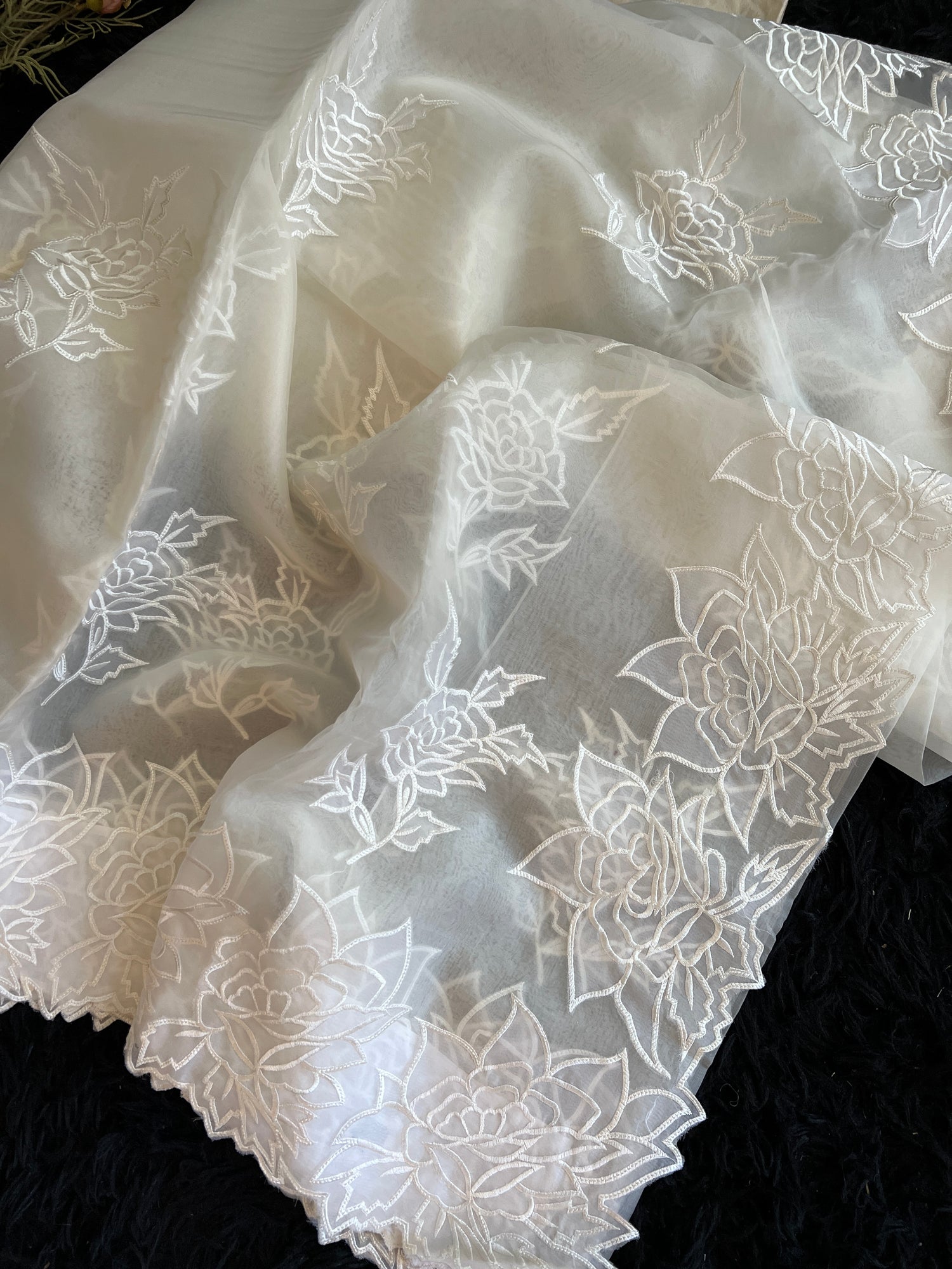 This refined ensemble pairs pearl white organza with an intricately crafted Chikankari blouse, showcasing delicate hand embroidery that exemplifies traditional artistry. The sheer, lightweight organza adds an ethereal elegance, while the detailed Chikankari work provides texture and cultural richness. Ideal for formal occasions, this combination offers a timeless blend of sophistication and heritage craftsmanship.