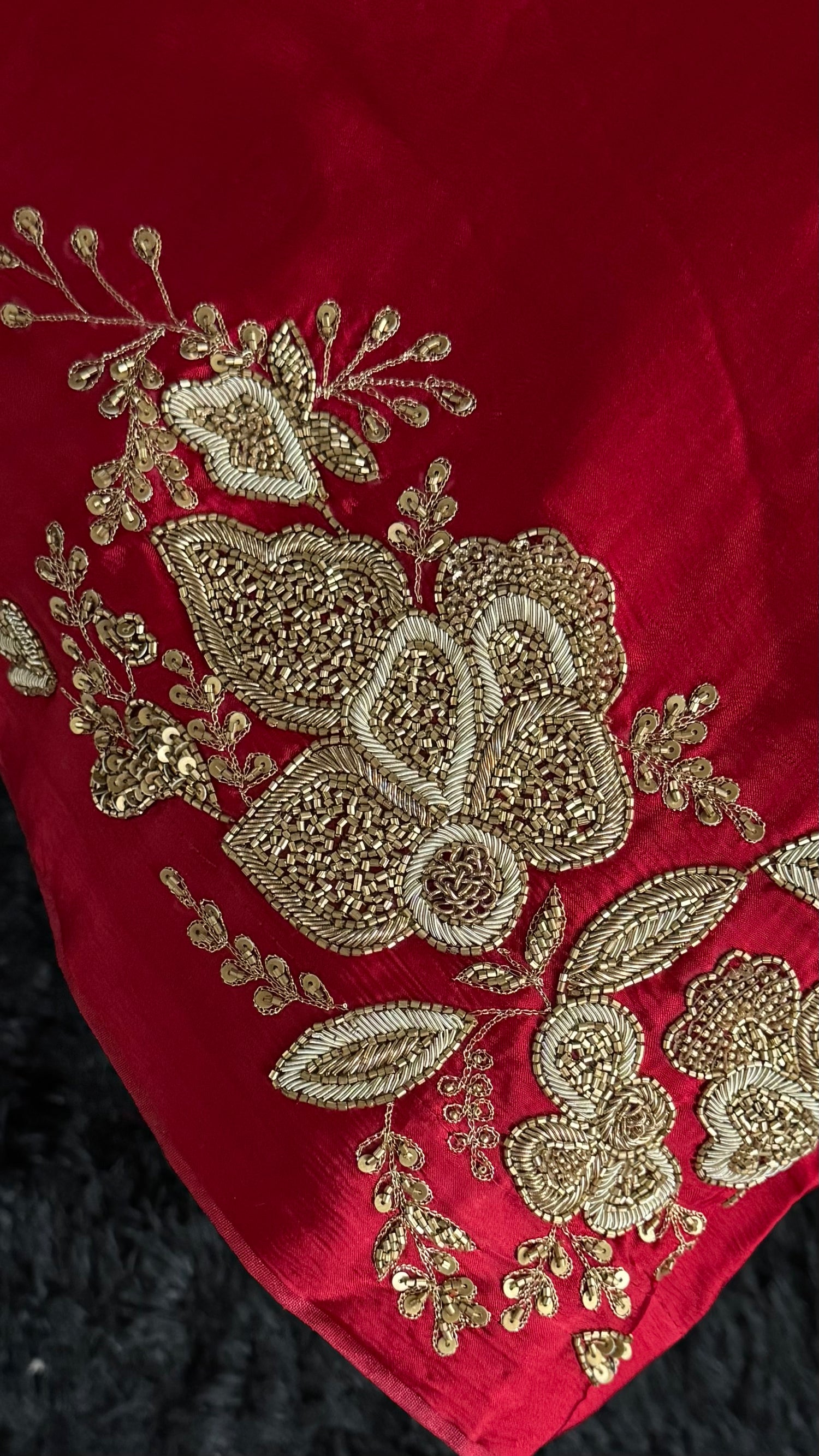 Red Chinon Satin With Single Antique Gold Aari Motif