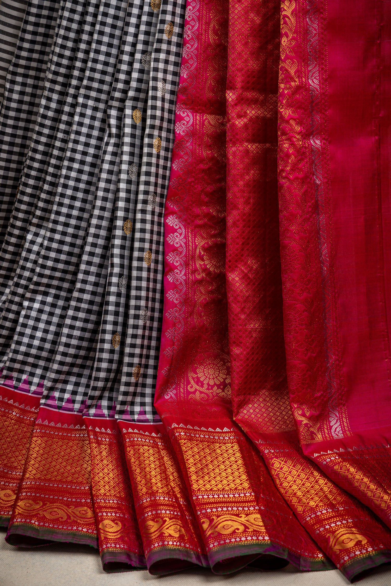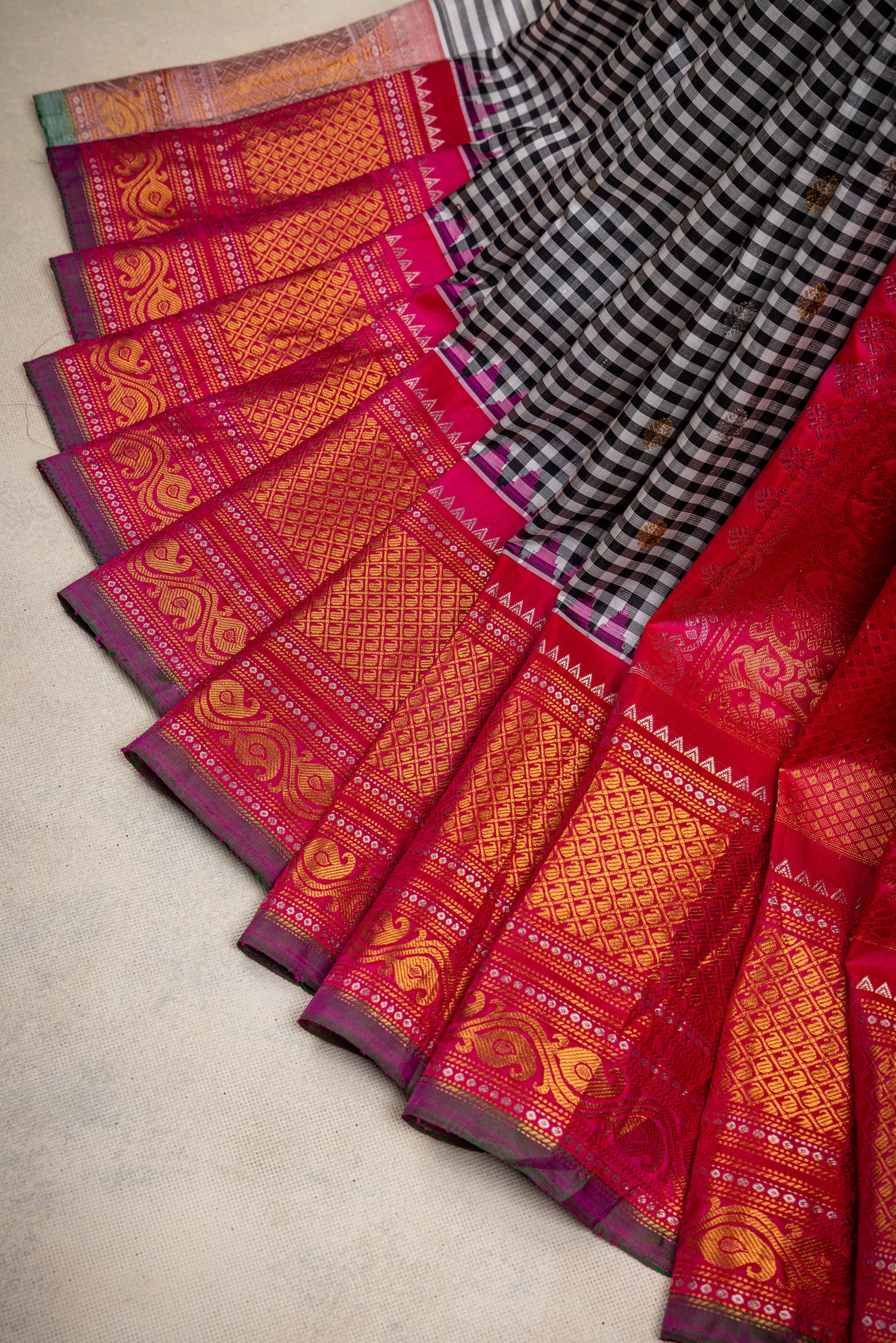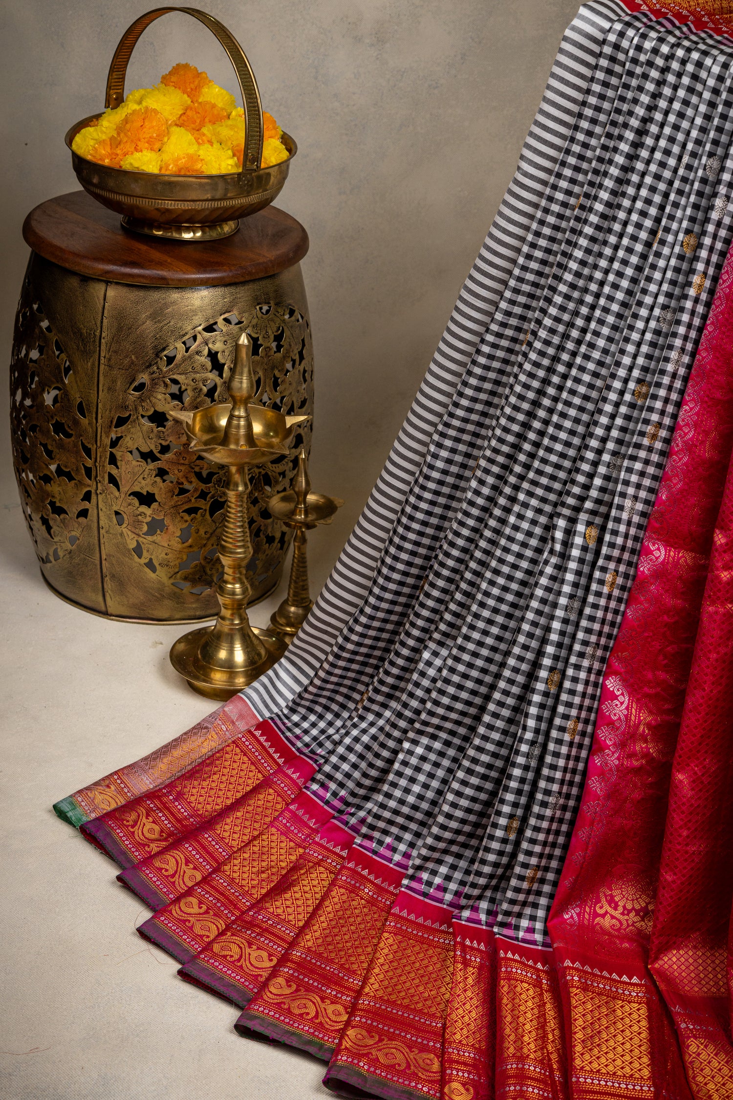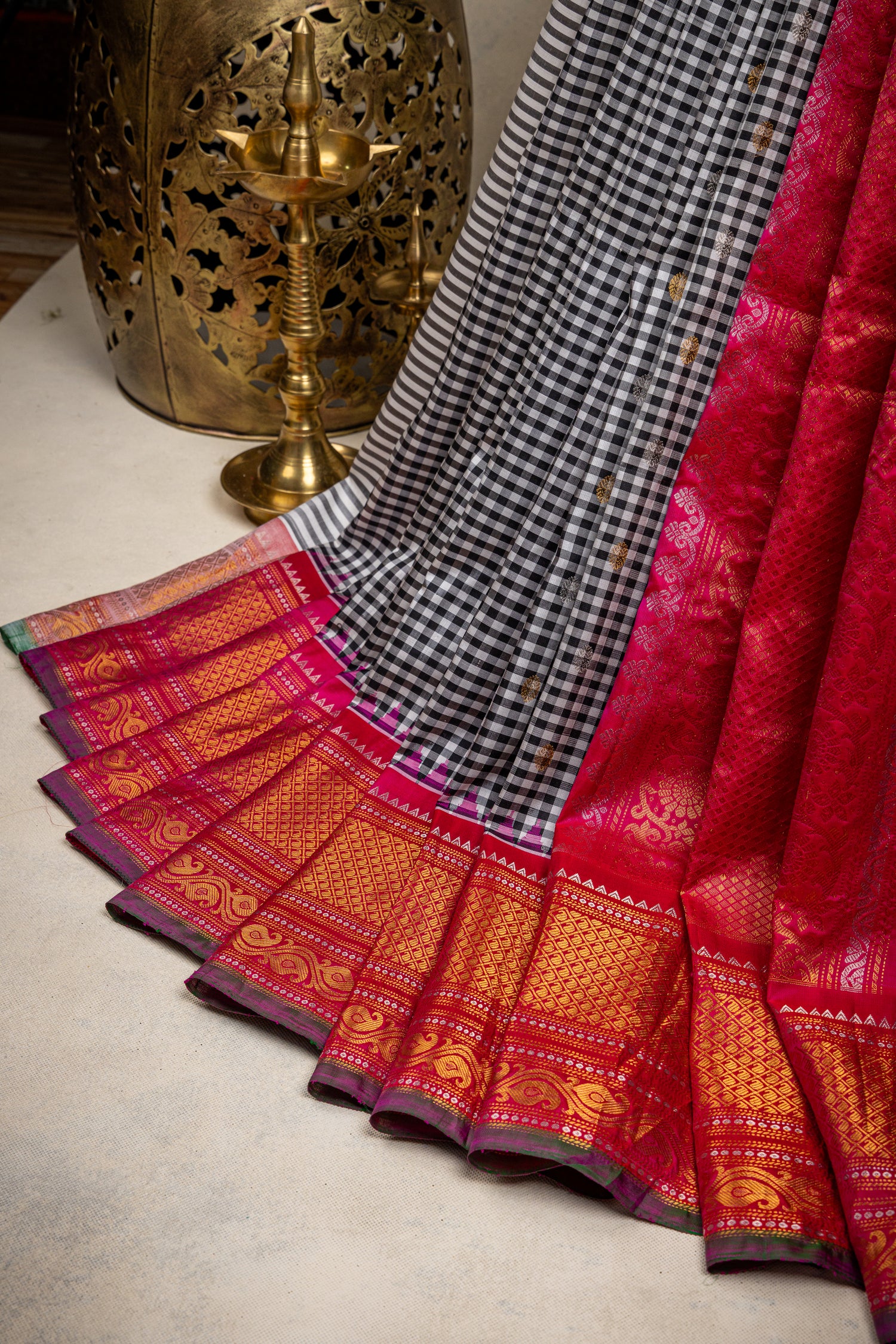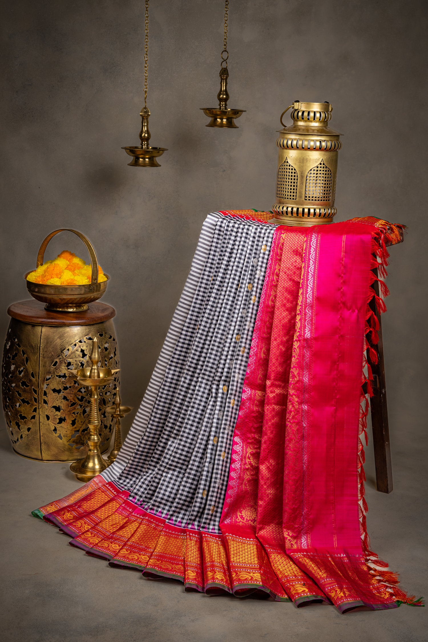 Discover the exquisite craftsmanship of Gadwal handloom Pure Silk sarees. Featuring a stunning white and black tiny check design with a contrasting Rani Pink border and pallu. Complete your look with the included Rani Pink blouse piece. Elevate your style with this timeless and elegant saree. 138
