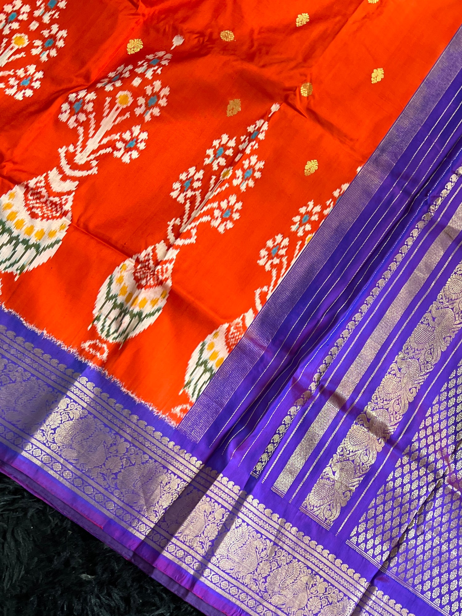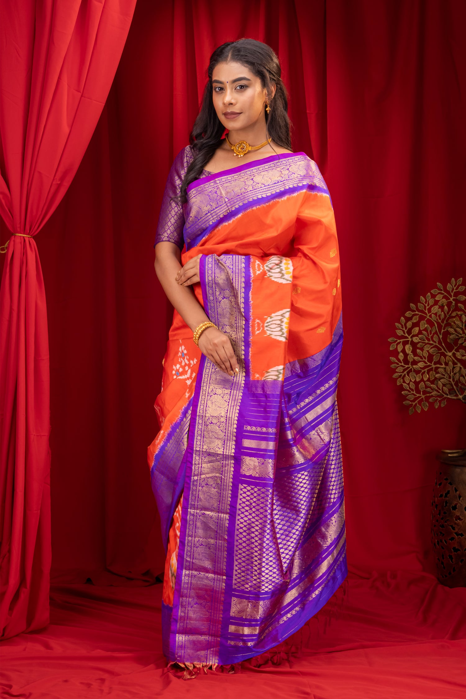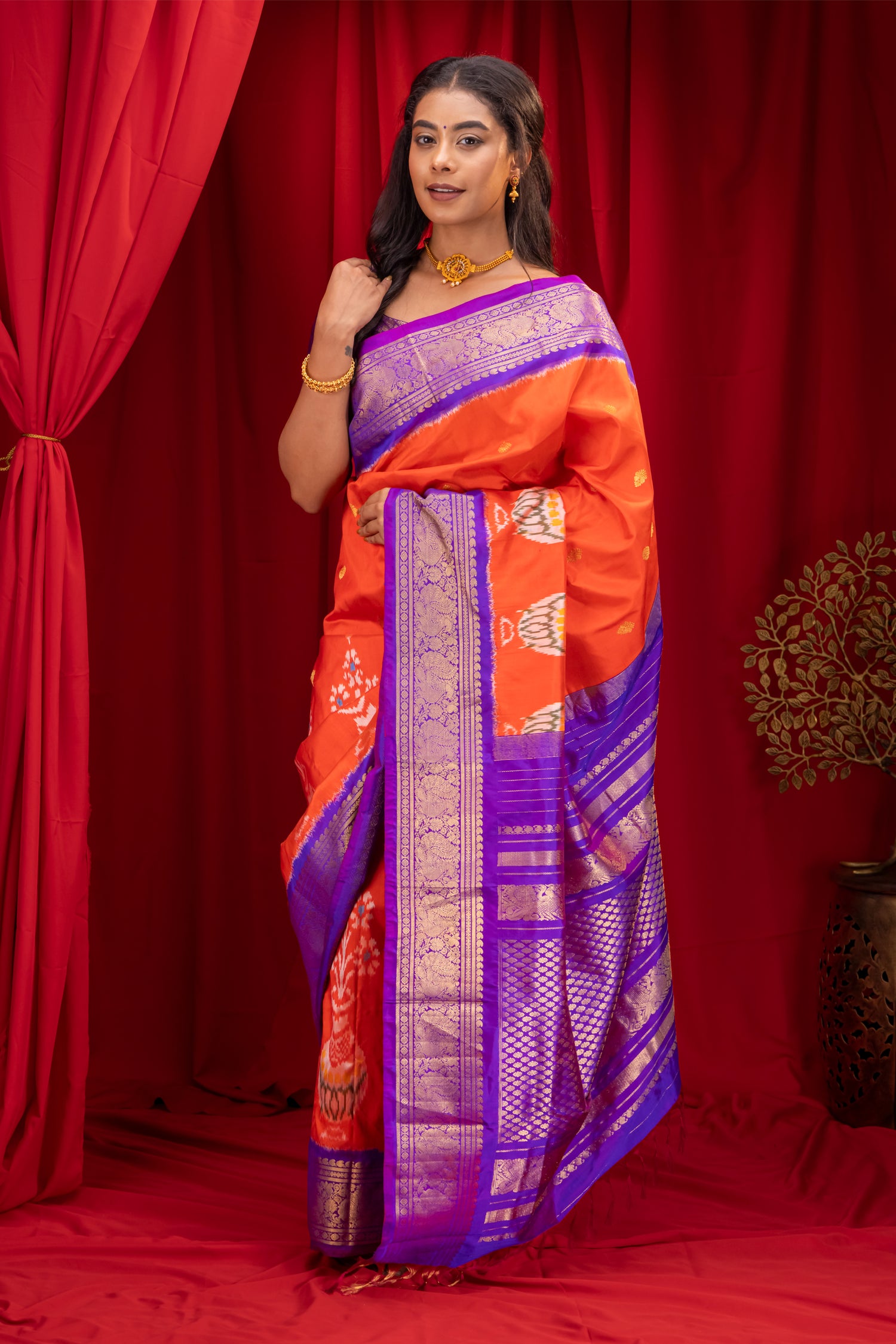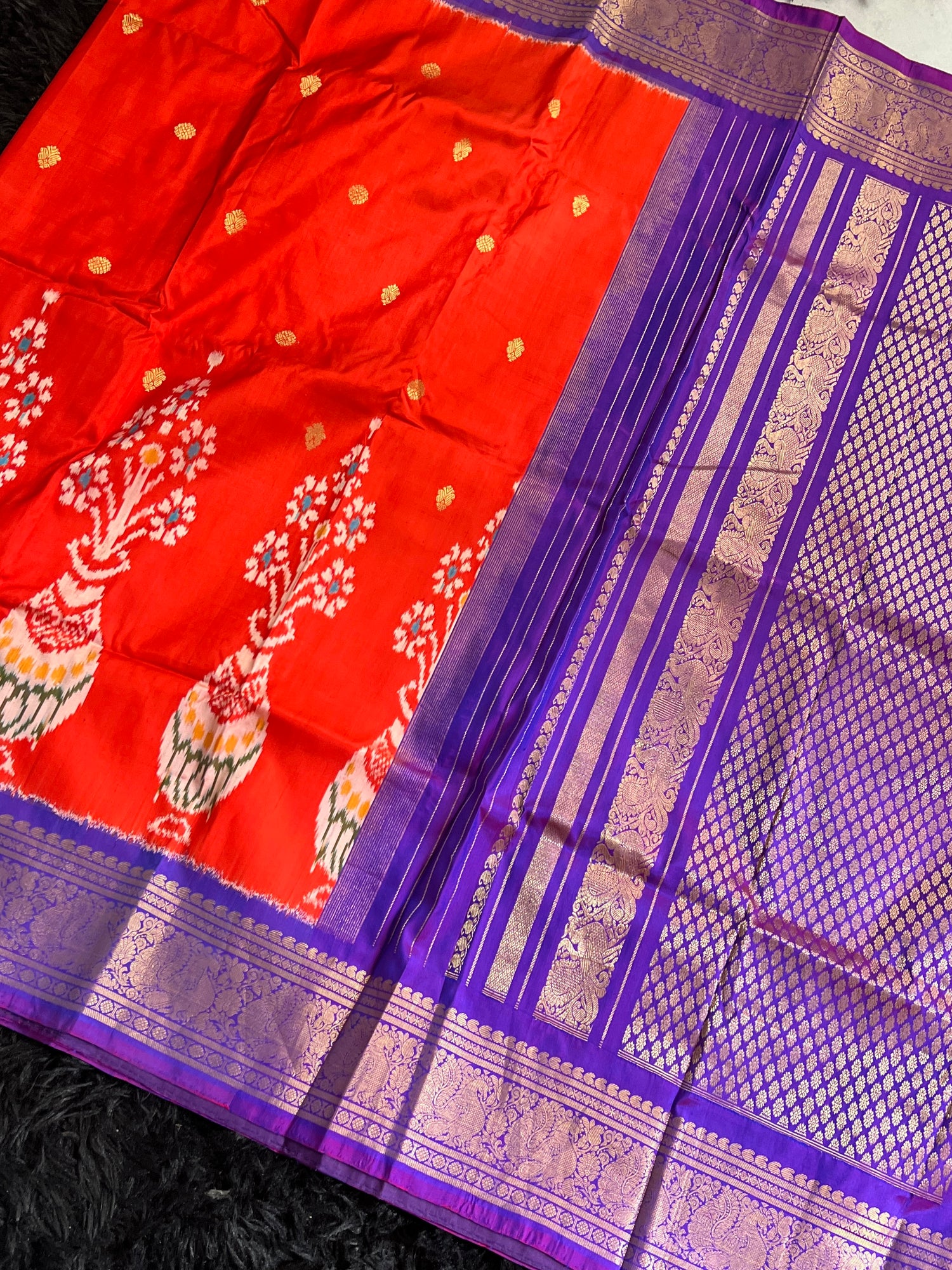 Experience the perfect blend of traditional and contemporary in our Ikkat Kanchipuram Fusion Handloom Pure Silk Saree. Crafted with a kanchipuram pure silk base and adorned with intricate Ikkat flower pot designs, this saree also comes with a pre-stitched blouse for added convenience. Elevate your wardrobe with this stunning piece today.