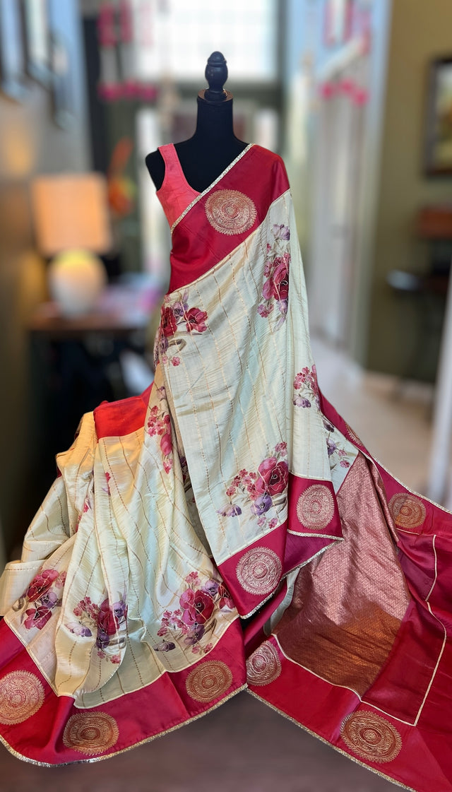 Experience the ultimate blend of tradition and modernity with Fusion Pure Silk saree. The classic pure silk fabric has been elevated with intricate floral print, crotia, and gold thread outlining. Impress with the perfect fusion of elegance and style.