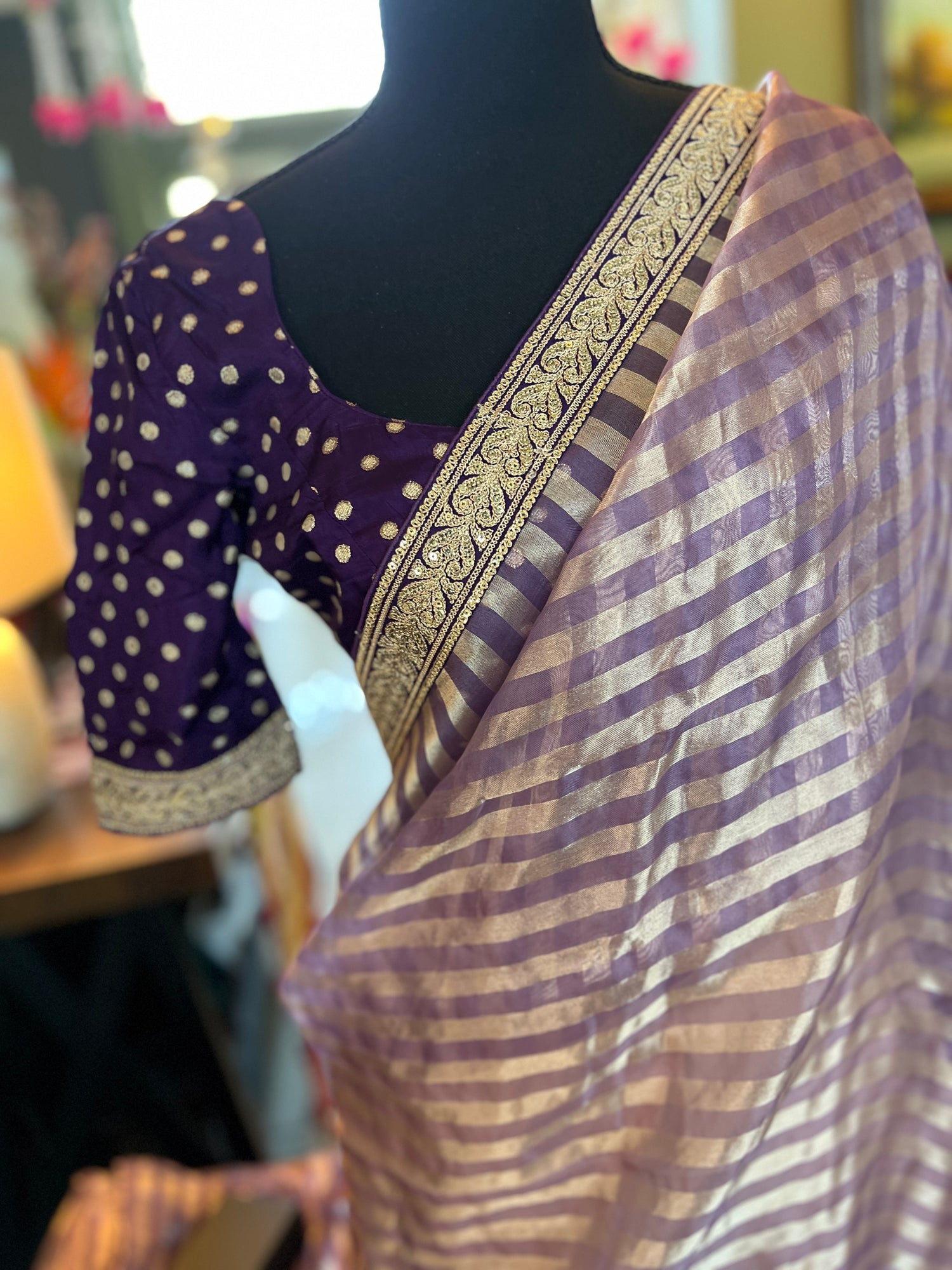 This expertly-crafted saree features alternating stripes of tissue and organza in a striking Lavender color. Made from pure organza and finished with a blouse piece, this saree is both elegant and versatile. Experience the luxurious feel of pure organza and elevate your style with this unique piece.