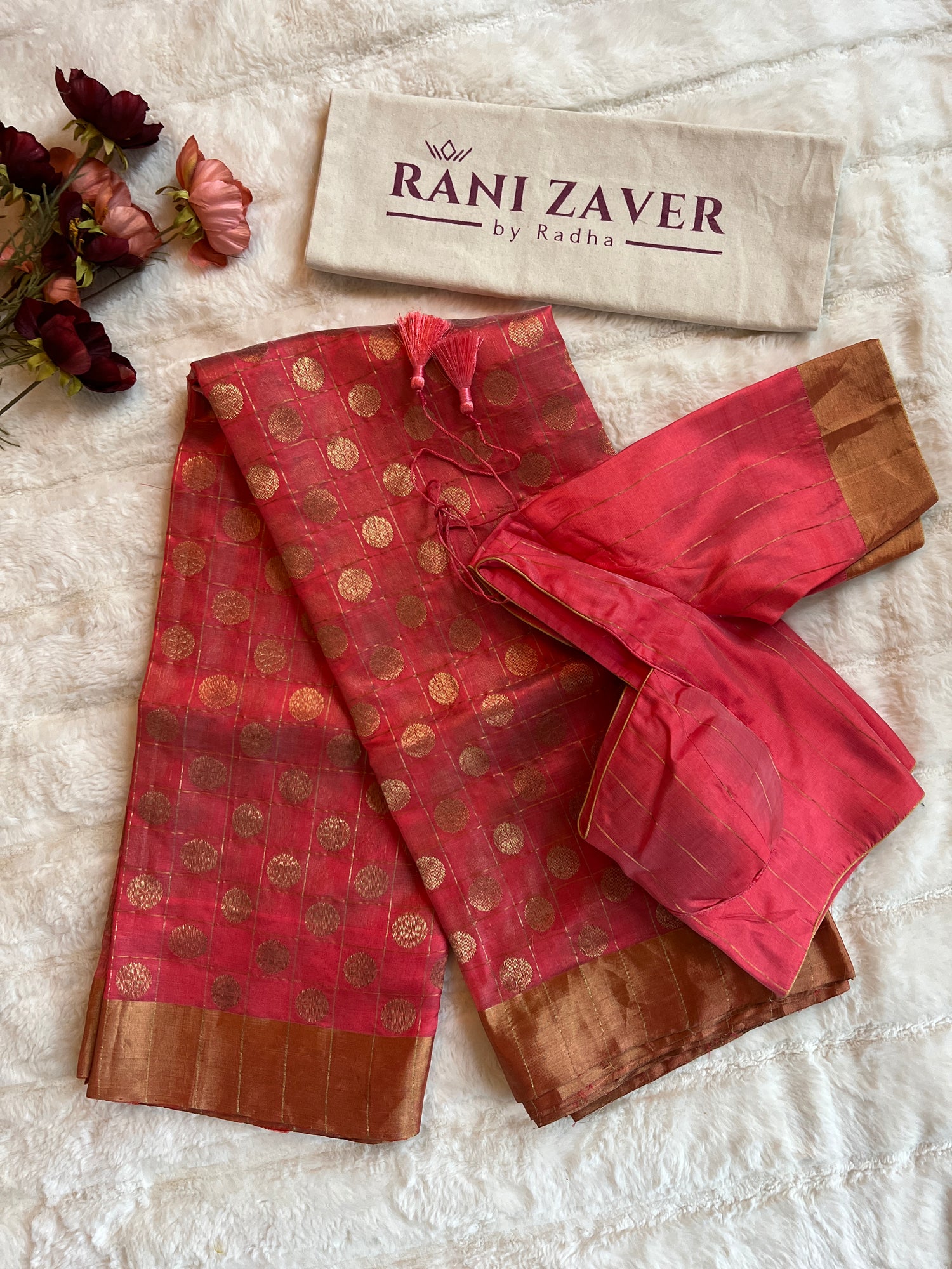 Expertly crafted with luxurious salmon color Chanderi Pattu Silk, this stunning saree is perfect for any occasion. Complete with a 38 size stitched blouse in stylish Sabyasachi choli cut, this saree is a timeless and elegant addition to any wardrobe. Elevate your style and make a statement with this exquisite piece.