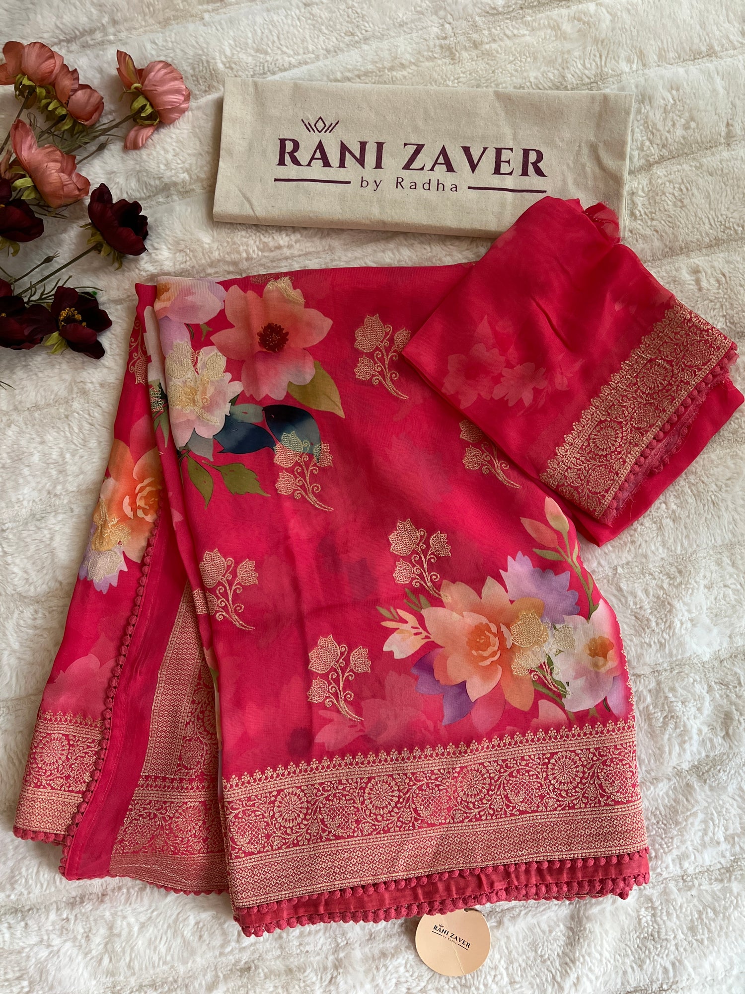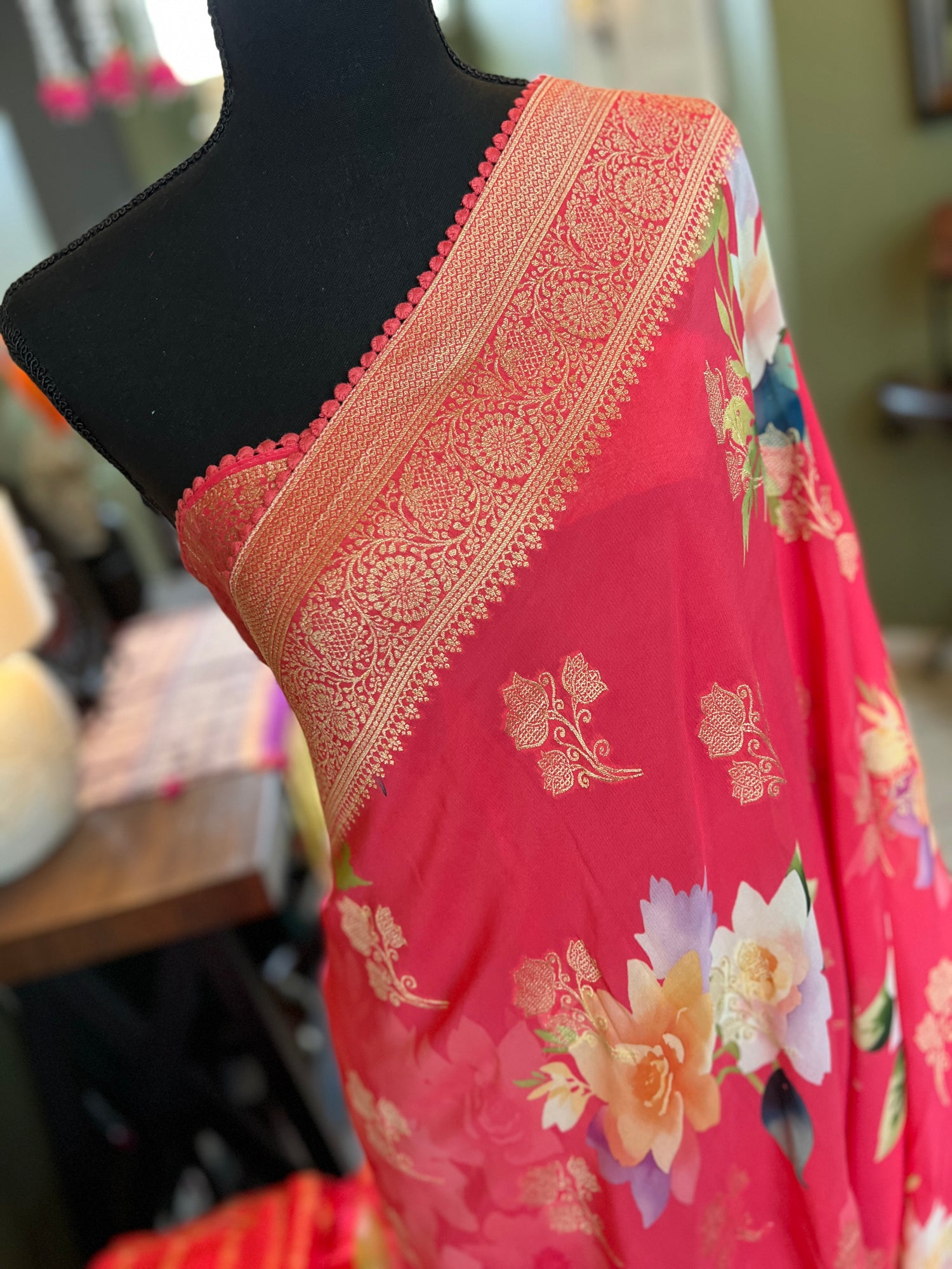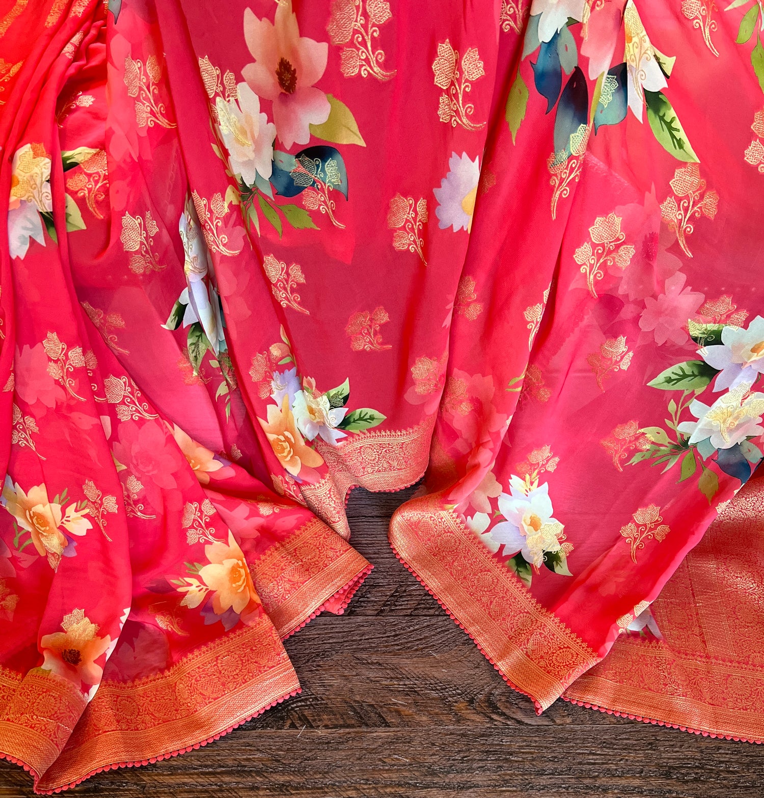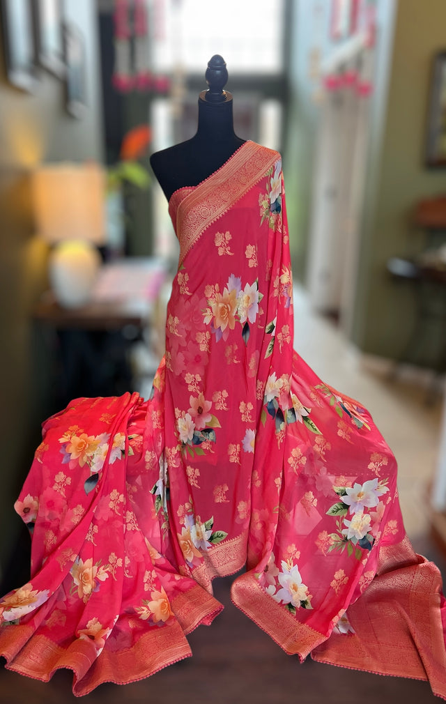 Salmon Floral Banaras Georgette with BP is backordered and will ship as soon as it is back in stock.
