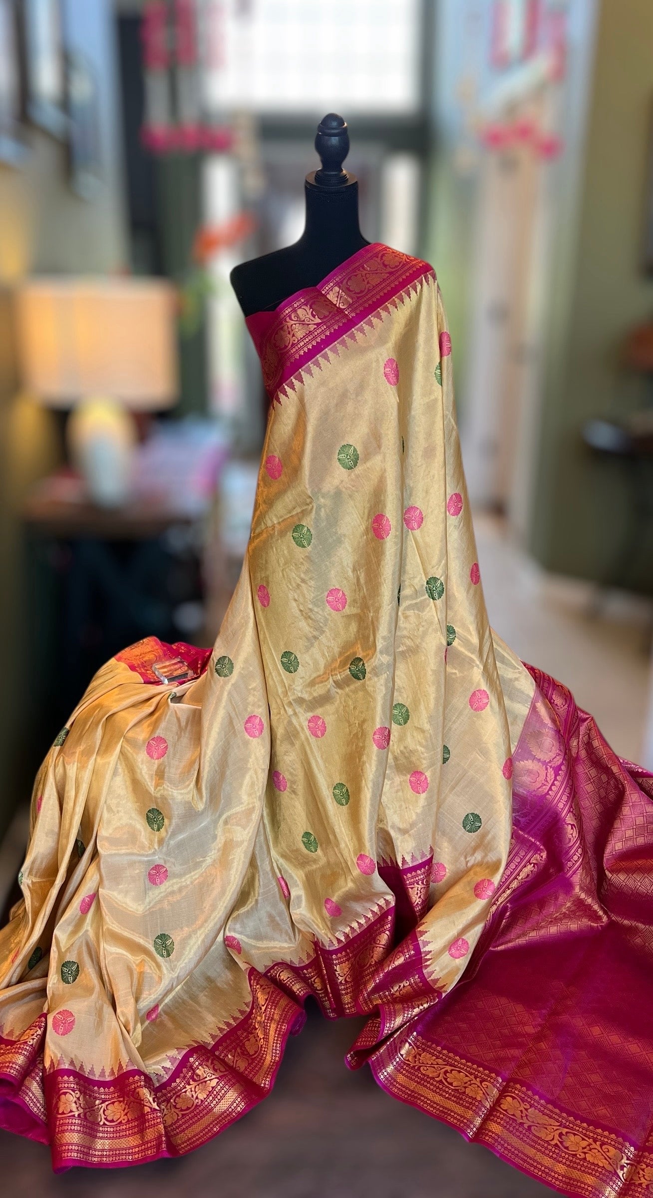 Crafted with pure silk and handloom techniques, the Tissue Gadwal saree is a luxurious addition to any wardrobe. The stunning gold and rani pink combo adds a touch of elegance and sophistication. Elevate your style with this expertly crafted piece, perfect for any occasion.