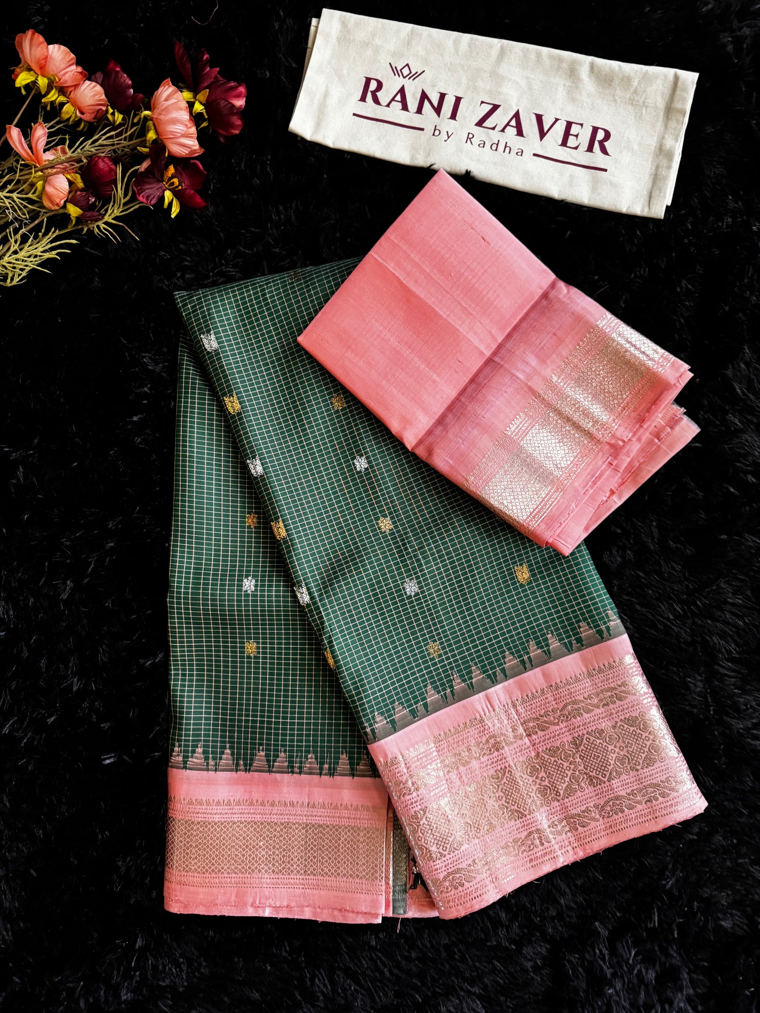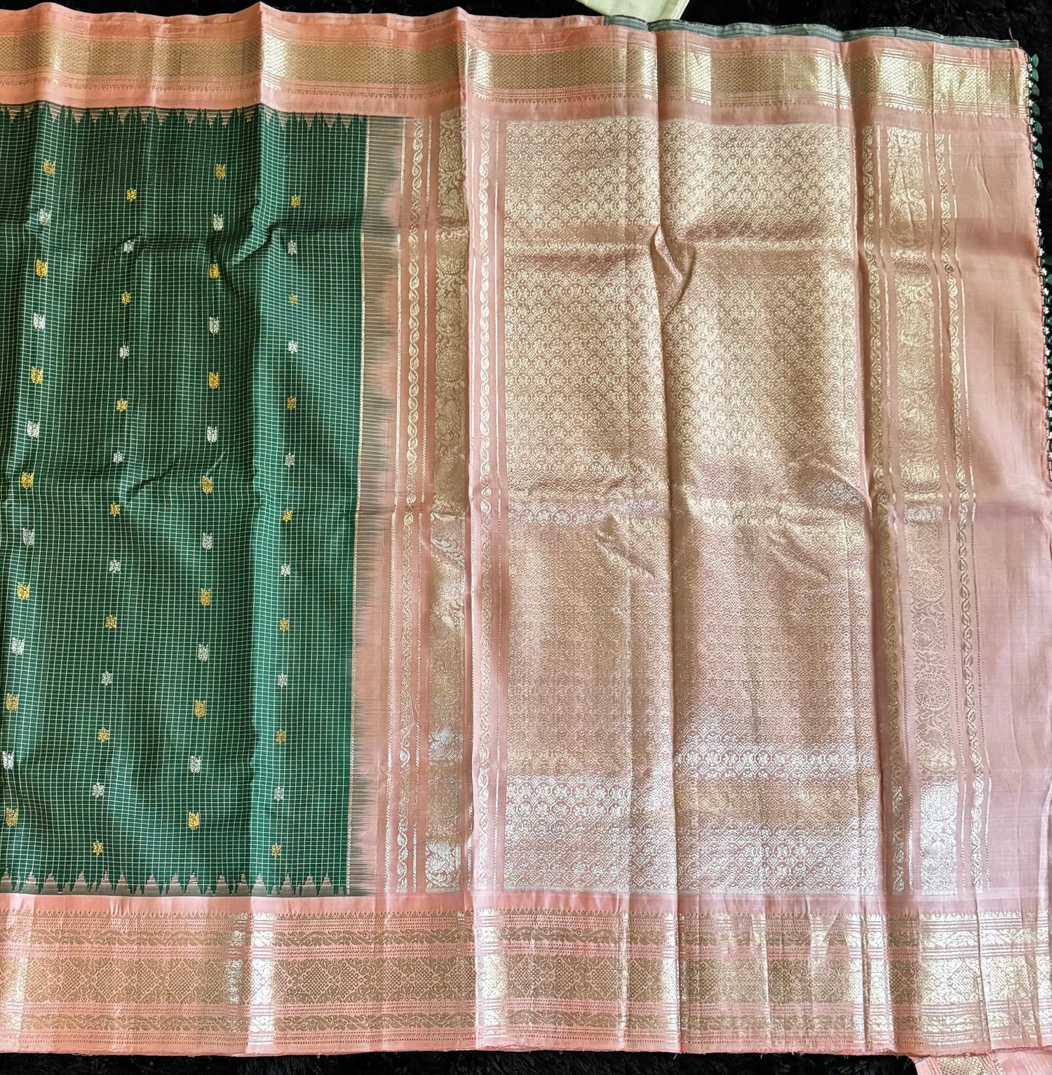 Forest Green/Peachy Pink Tiny Checks Gadwal Handloom Pure Silk