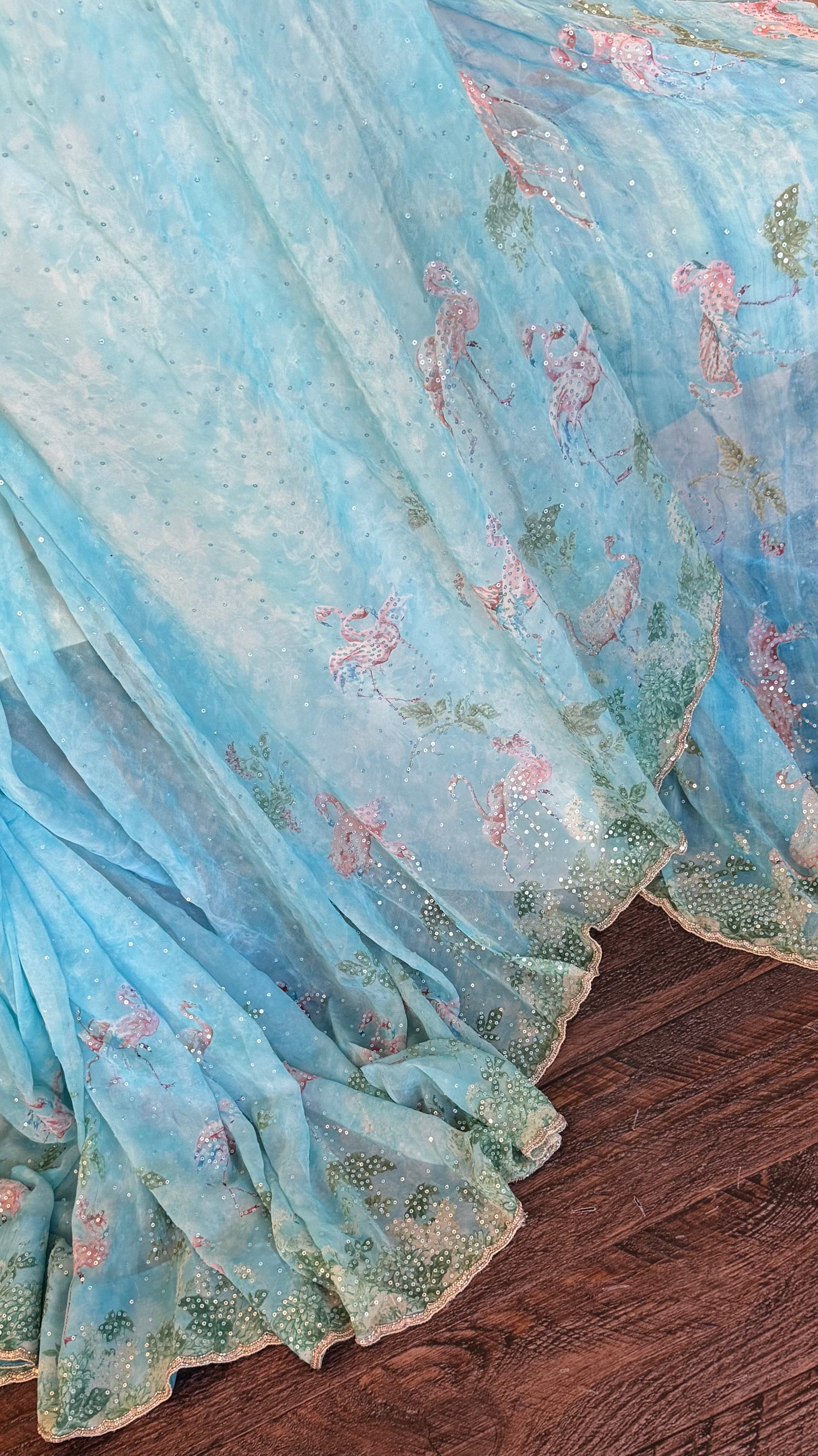 Georgette Blue Swans Design. Has some sequins work as well. Paired with a matching Tissue blouse