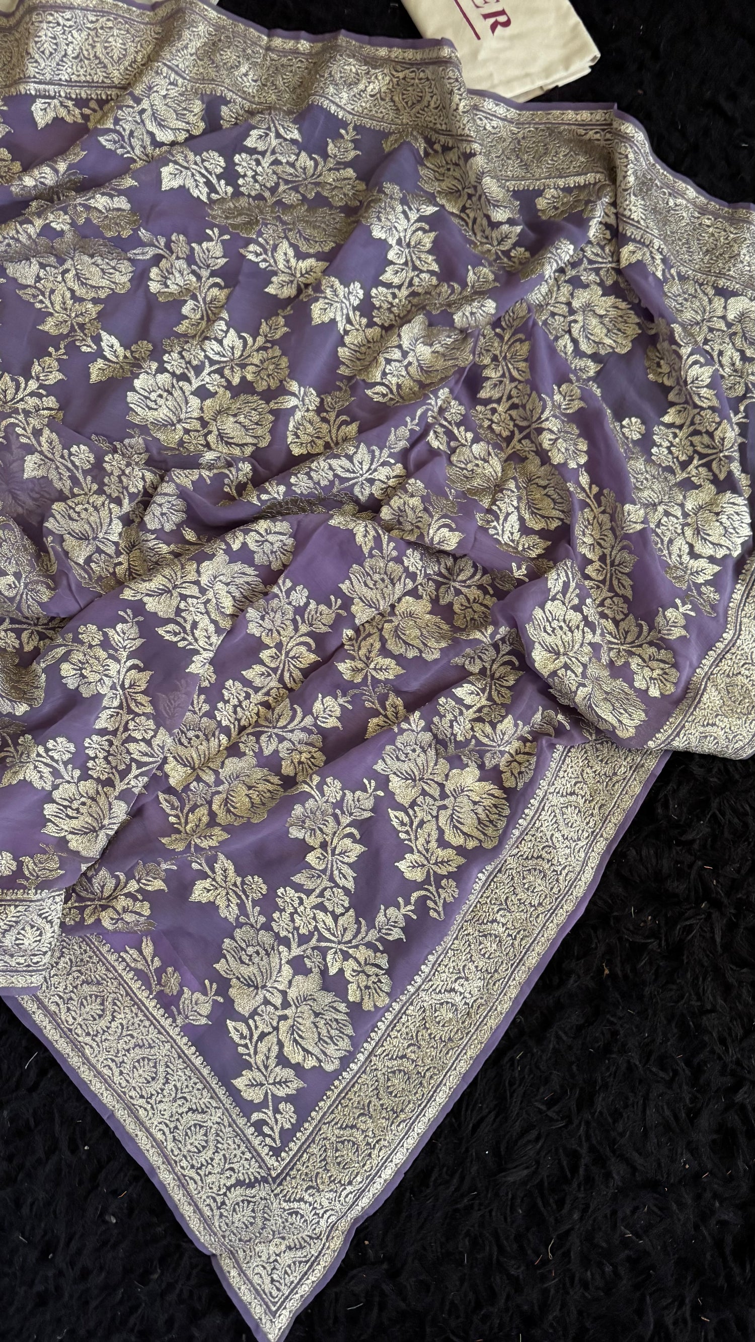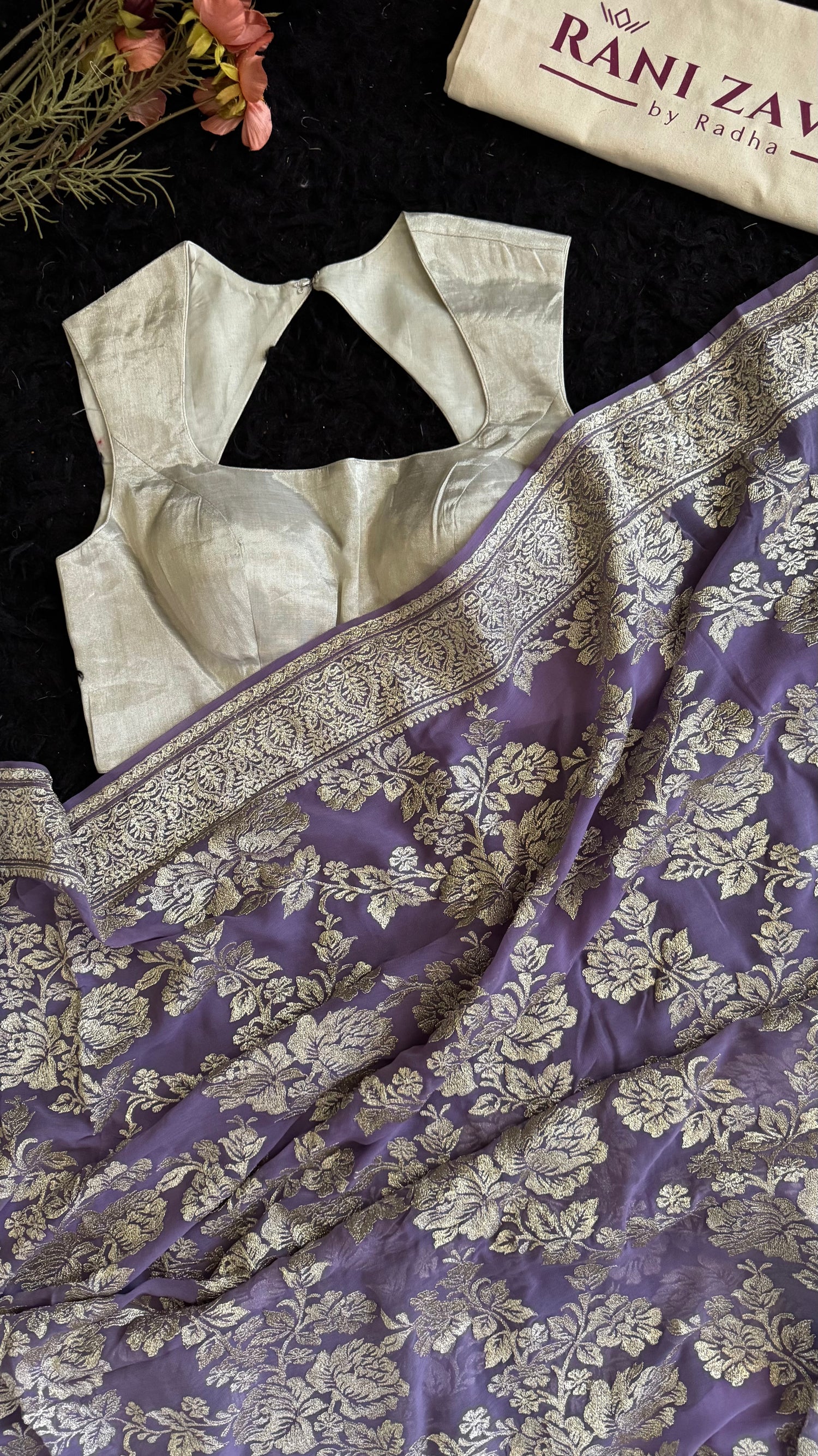 Lavender Georgette with silver Pita zari with silver tissue blouse