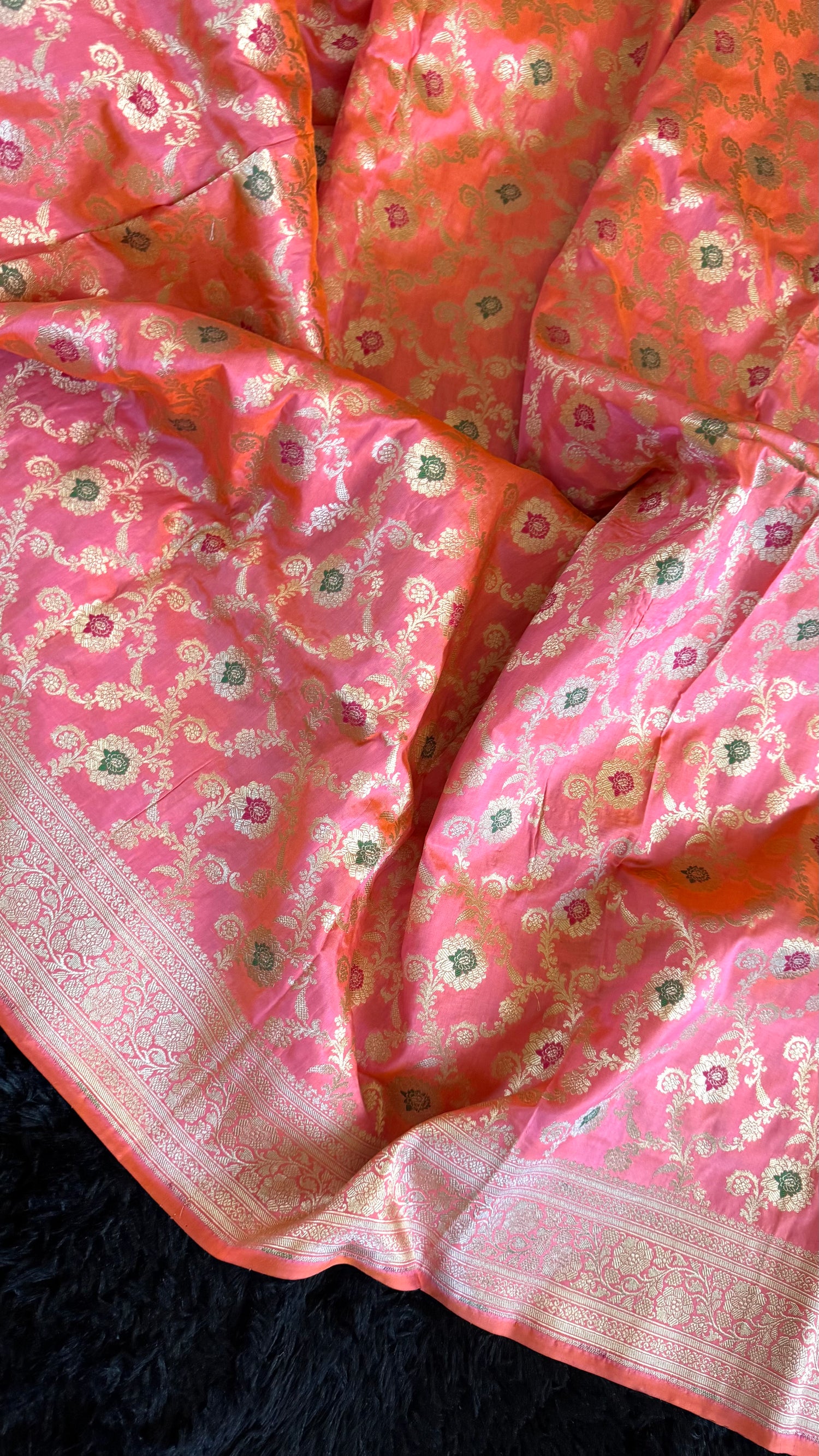 Peach Pink Pure Banaras Katan Silk is backordered and will ship as soon as it is back in stock.