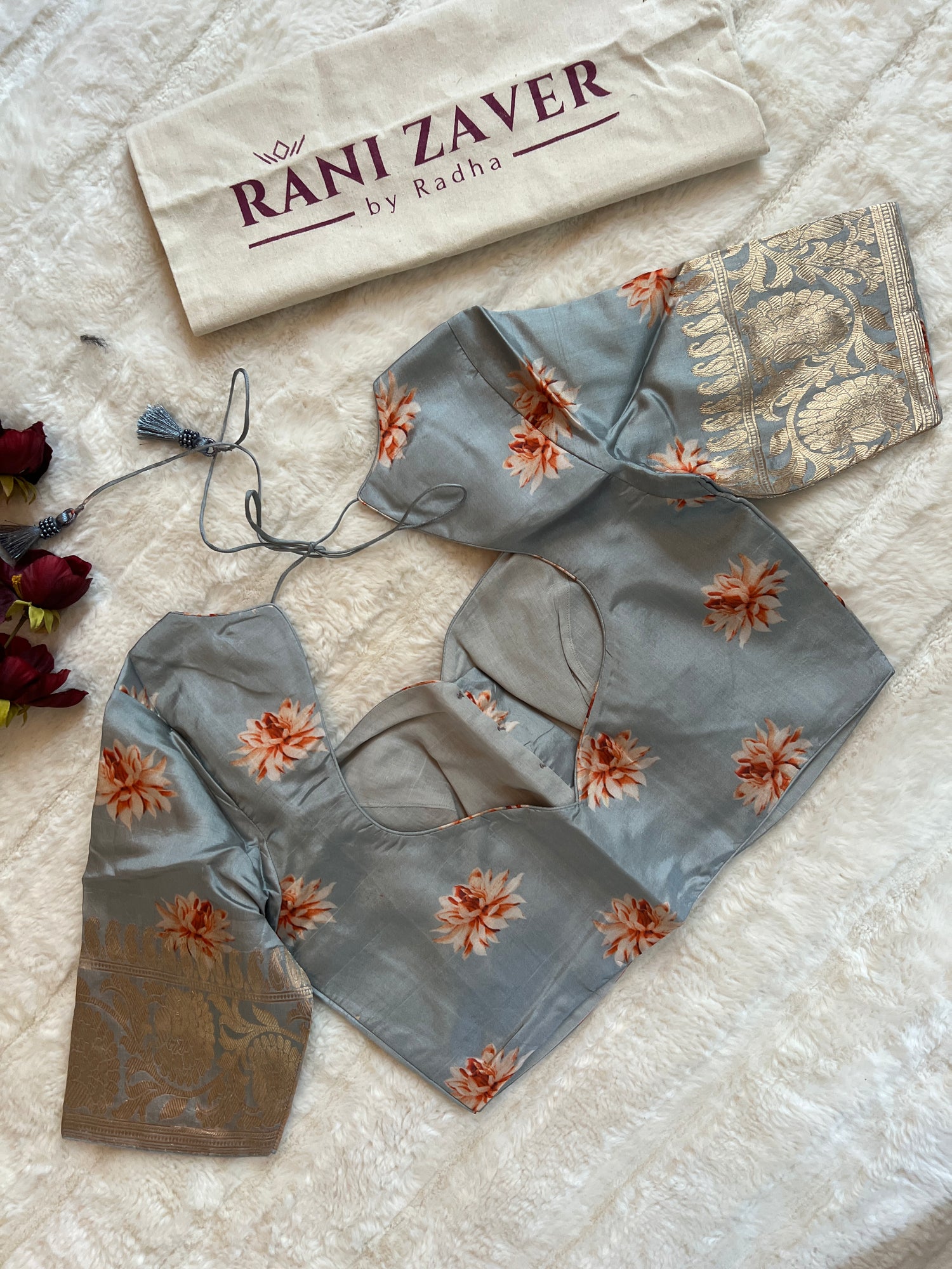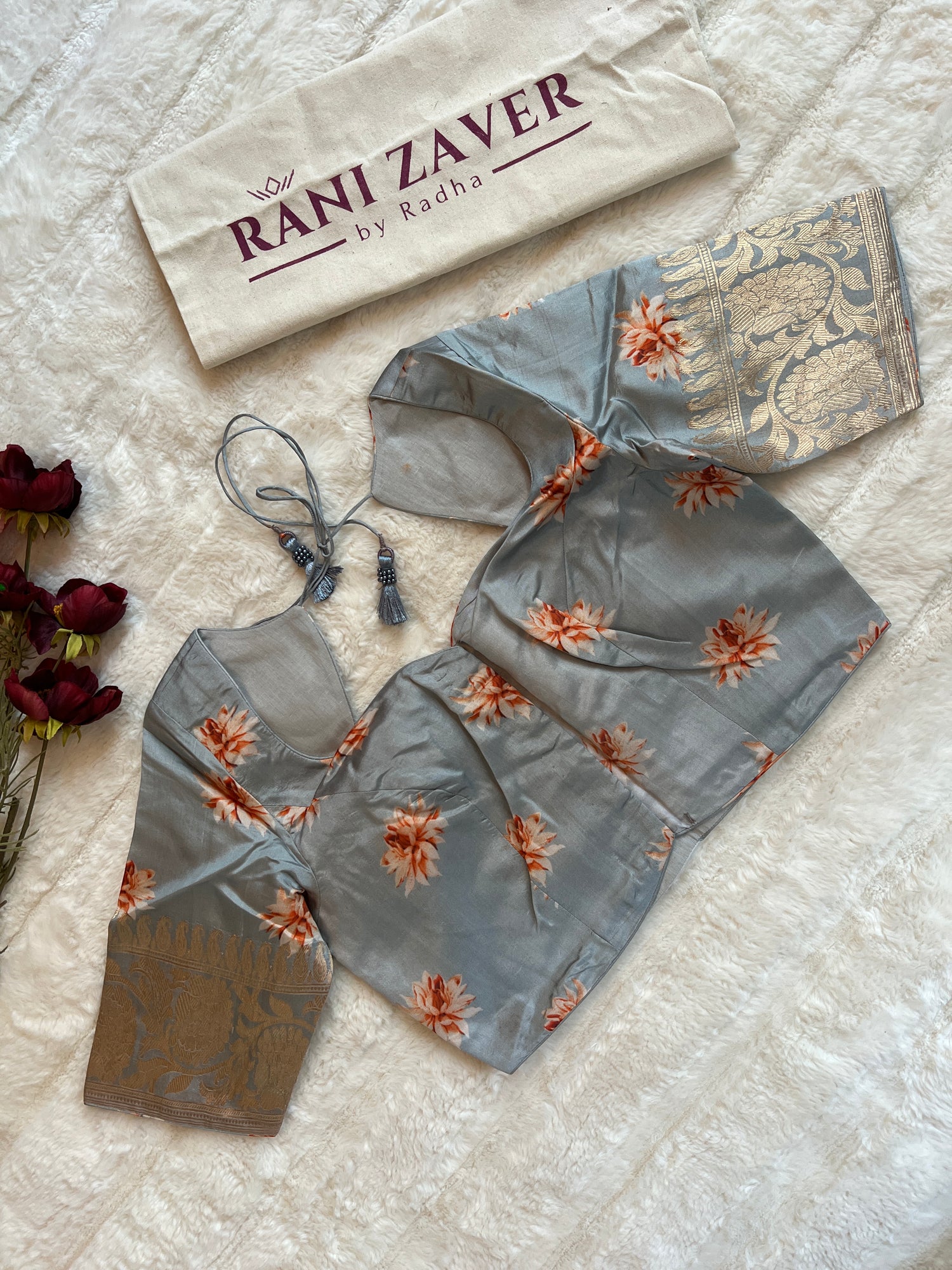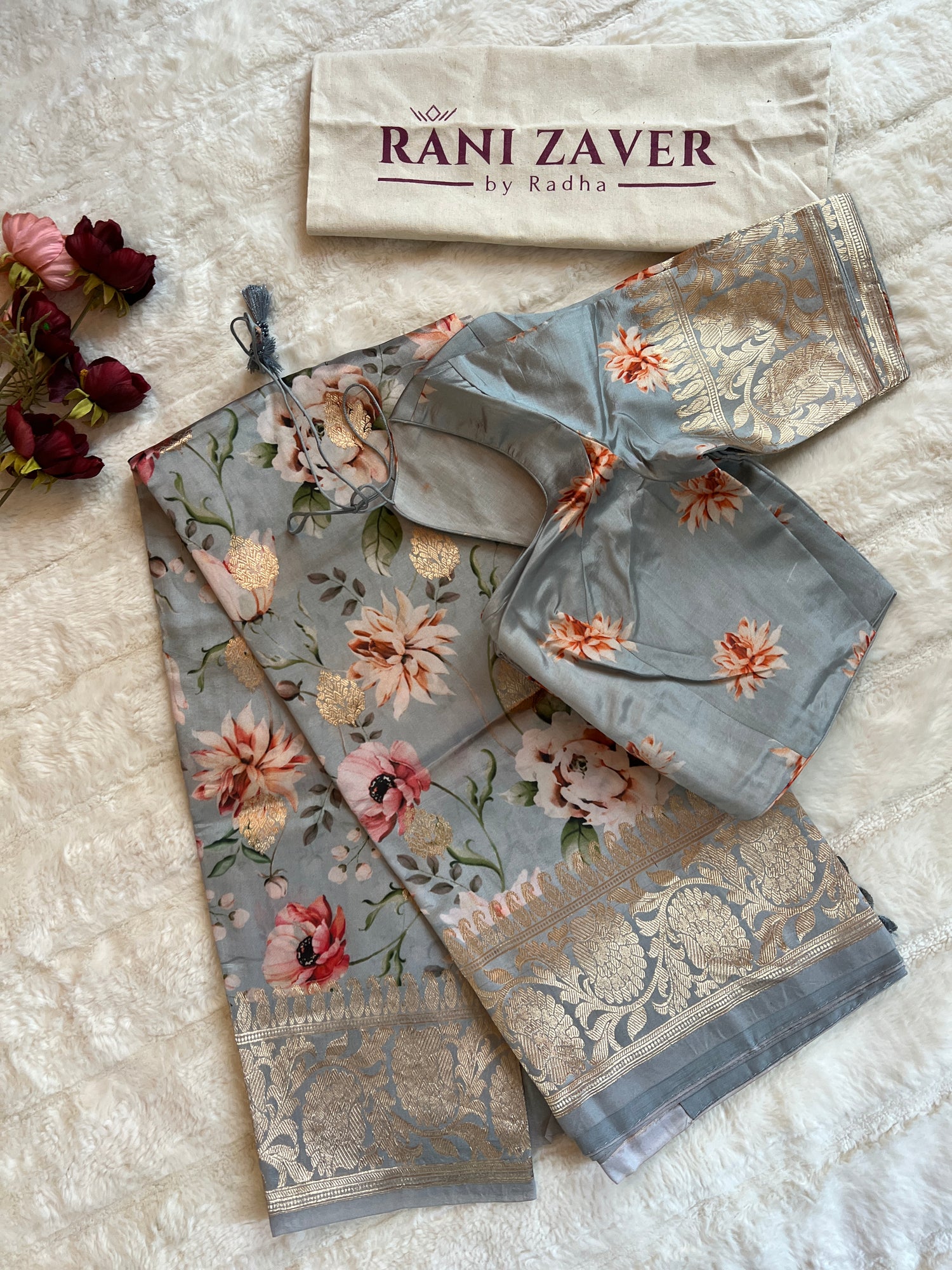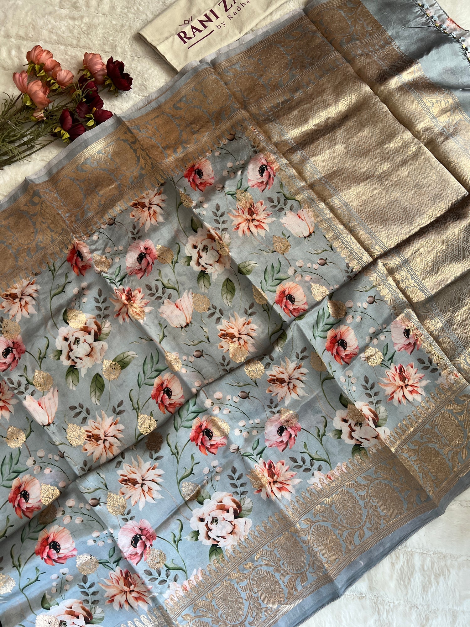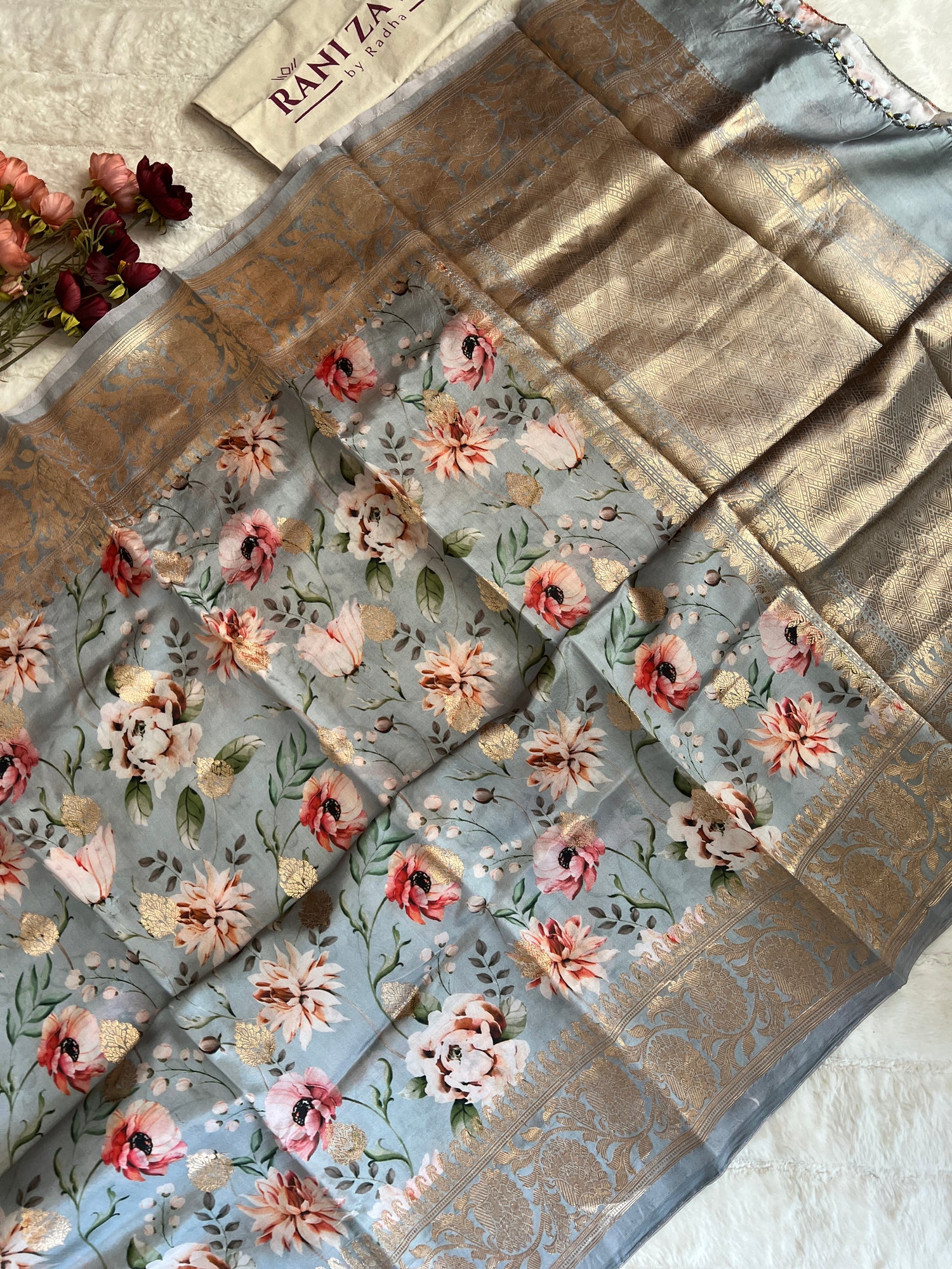 Powder Blue Floral Digital Print Banaras Lightweight Pure SIlk