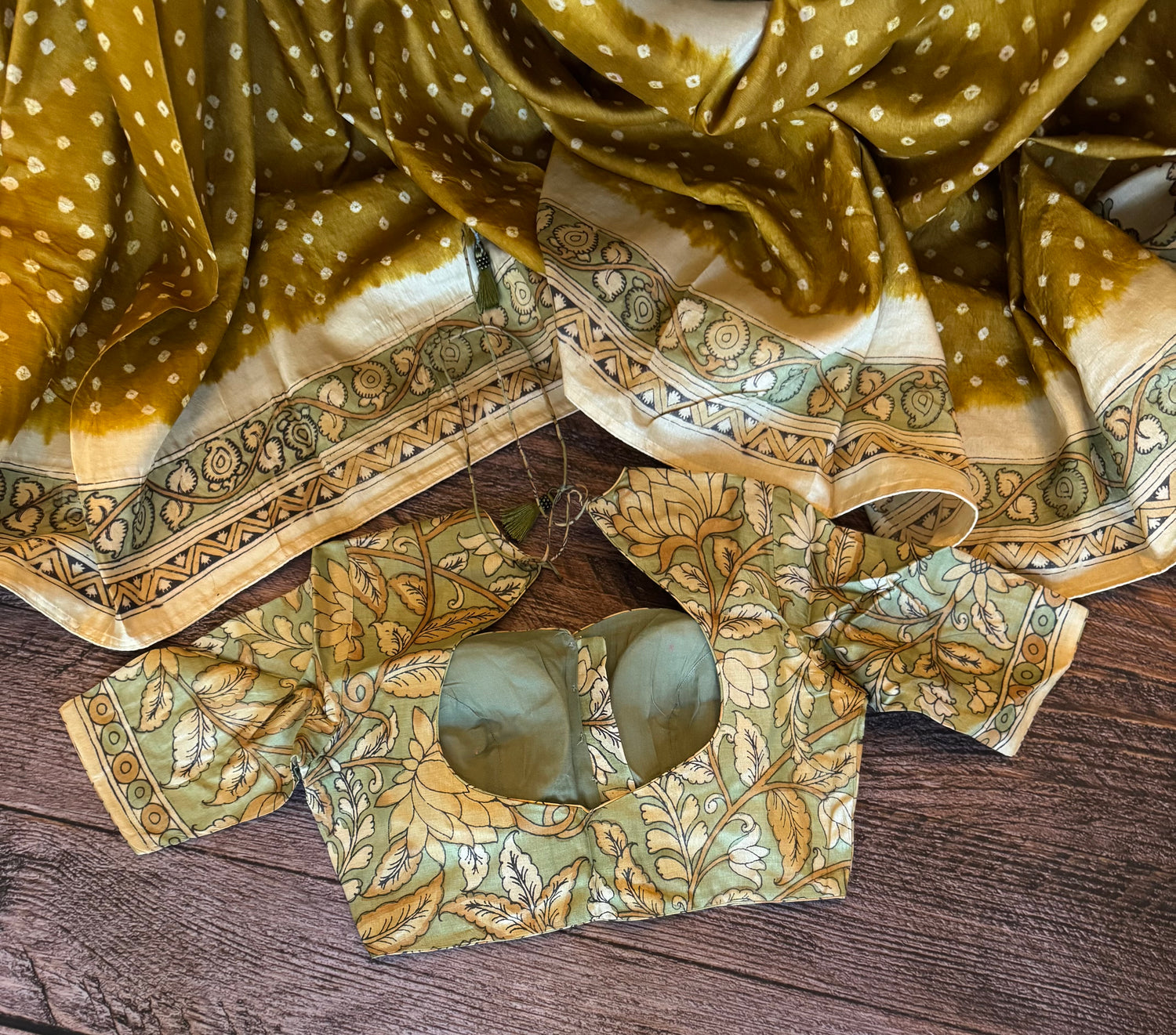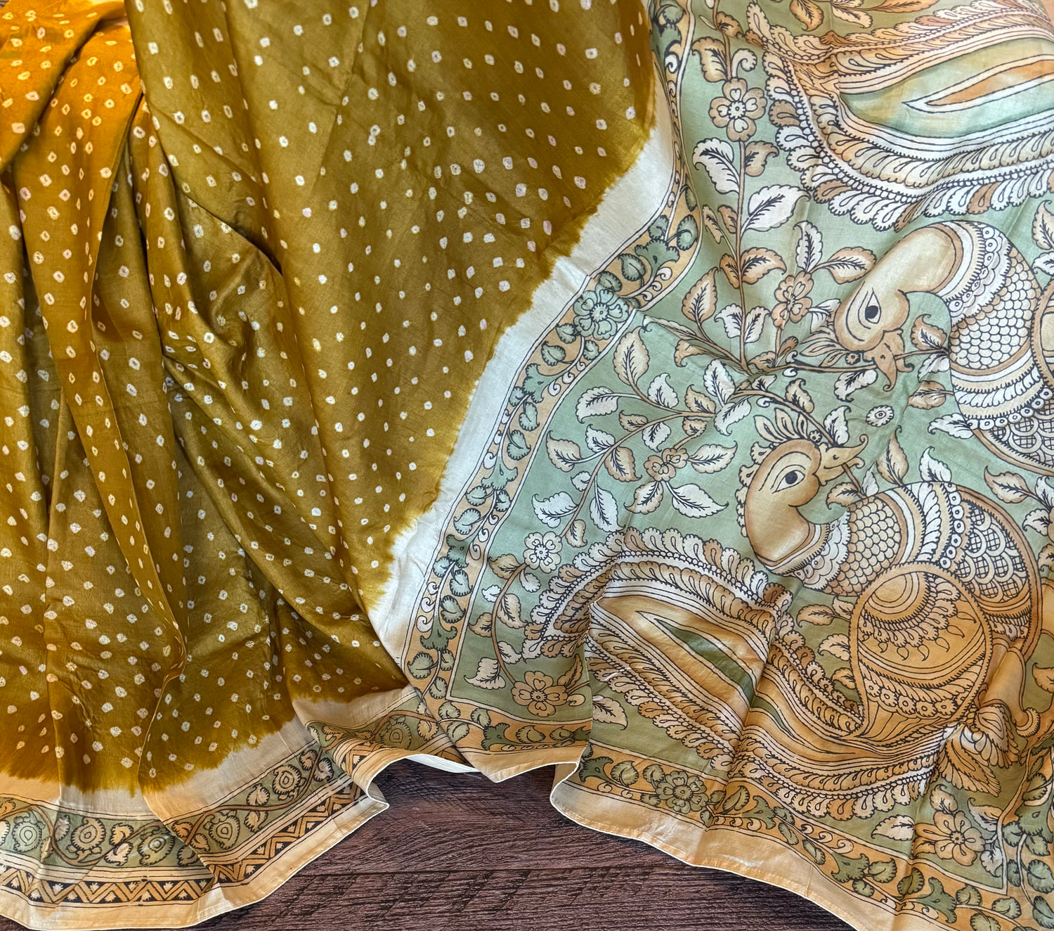 Rai Bandhej with Pen Kalamkari on Gachi Tussar - Ochre Body with sage green Contrast