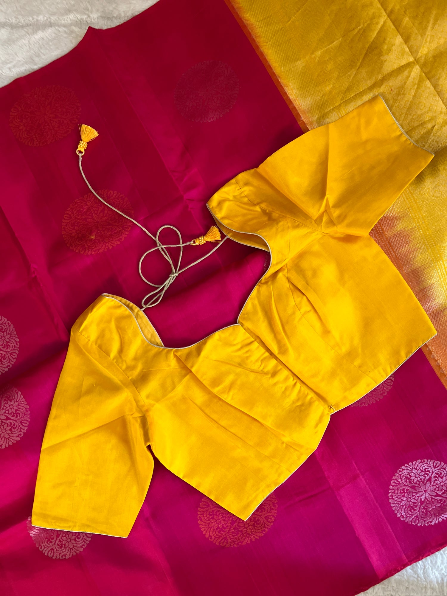 Rani Pink Yellow Kanchi Soft SIlk borderless is backordered and will ship as soon as it is back in stock.