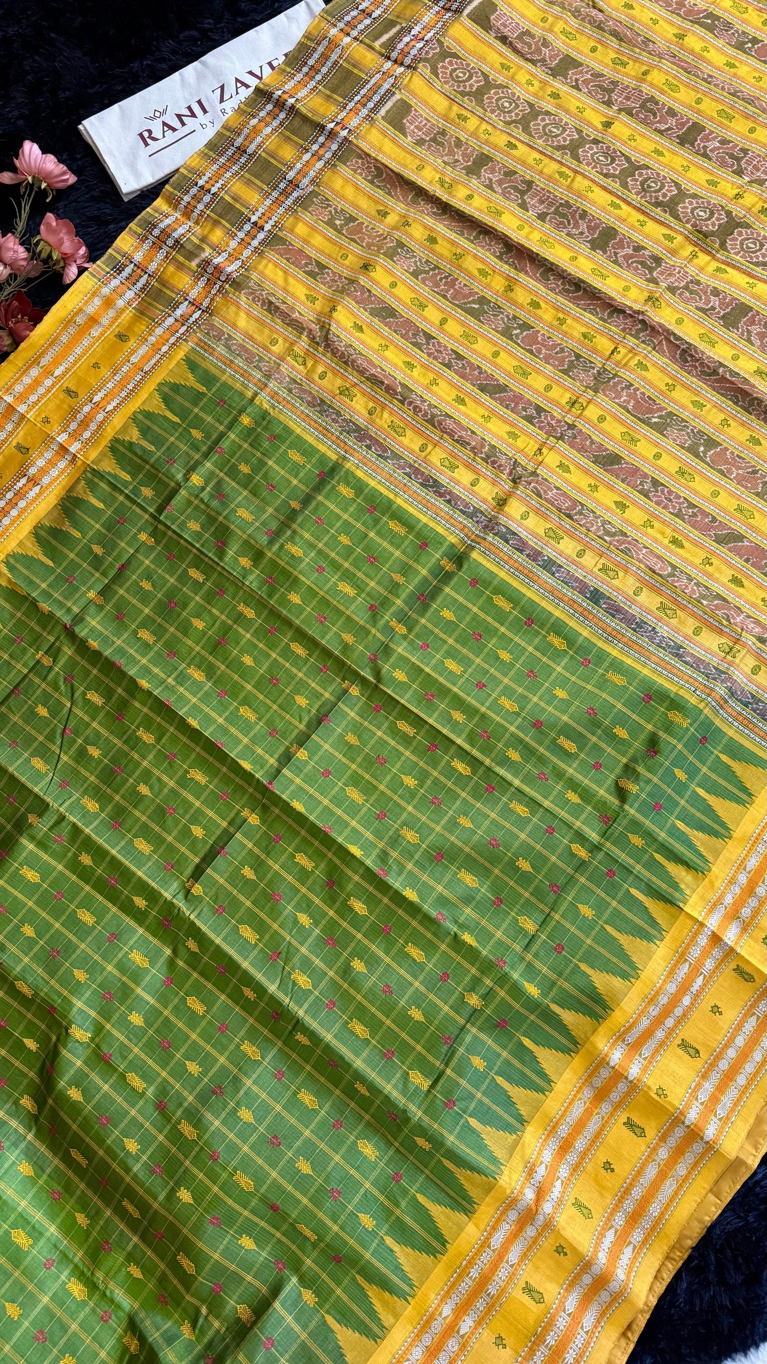 Sambalpuri Double Ikkat Hazaar butti Olive Green Mustard Yellow