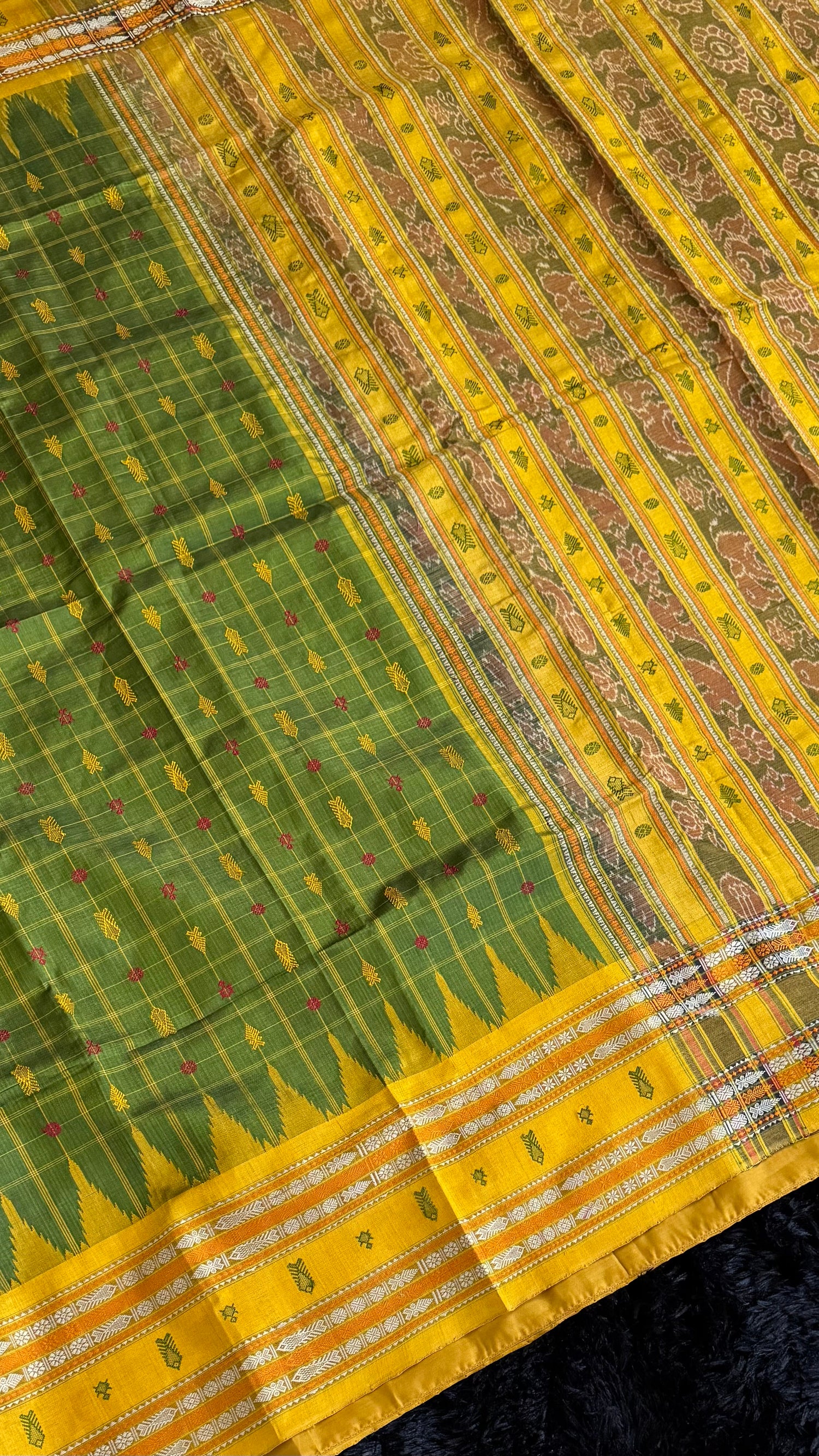 Sambalpuri Double Ikkat Hazaar butti Olive Green Mustard Yellow. Pure Handloom Silk Saree.