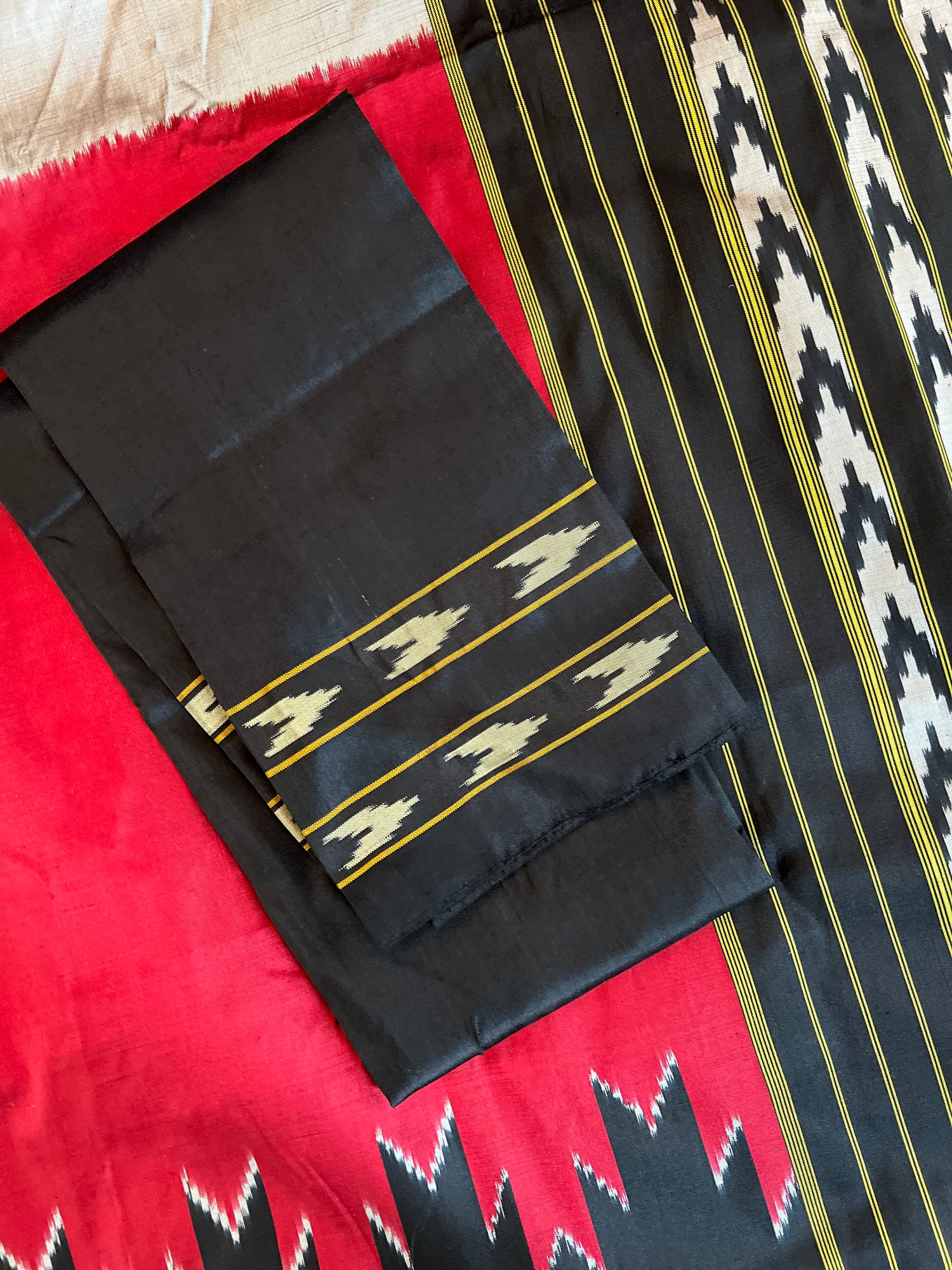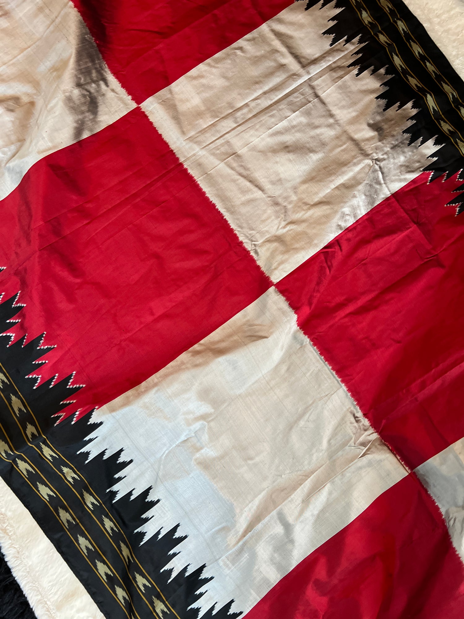 This Silver Maroon Large Squares Single Ikkat fabric is a handloom masterpiece woven from pure silk. Featuring bold maroon and silver large square patterns created through traditional single ikkat dyeing, it showcases expert artisan skill and cultural artistry. The handloom weave ensures a rich texture and durability, while the pure silk offers a luminous finish and smooth touch. Ideal for crafting distinctive attire or elegant accessories that combine timeless craftsmanship with luxurious quality.