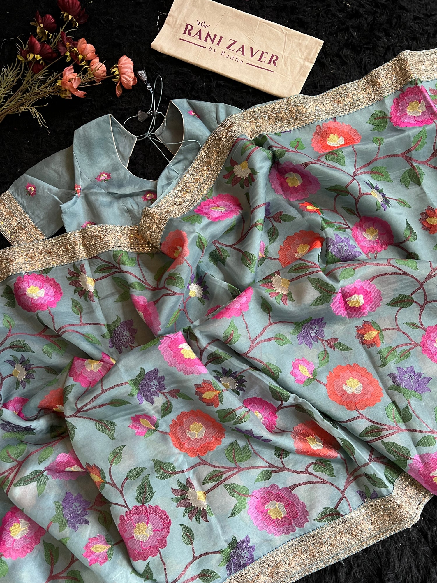 This Sky Blue Embroidered Floral Organza showcases expert craftsmanship with delicate floral embroidery on a sheer, airy fabric. The serene sky blue shade enhances its elegant appeal, making it an ideal choice for sophisticated events. Its lightweight texture ensures graceful draping, combining beauty and comfort effortlessly.