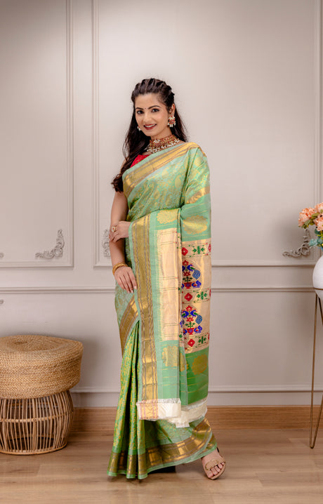 Pink green Kadiyal Maharani Paithani Handloom Pure Silk