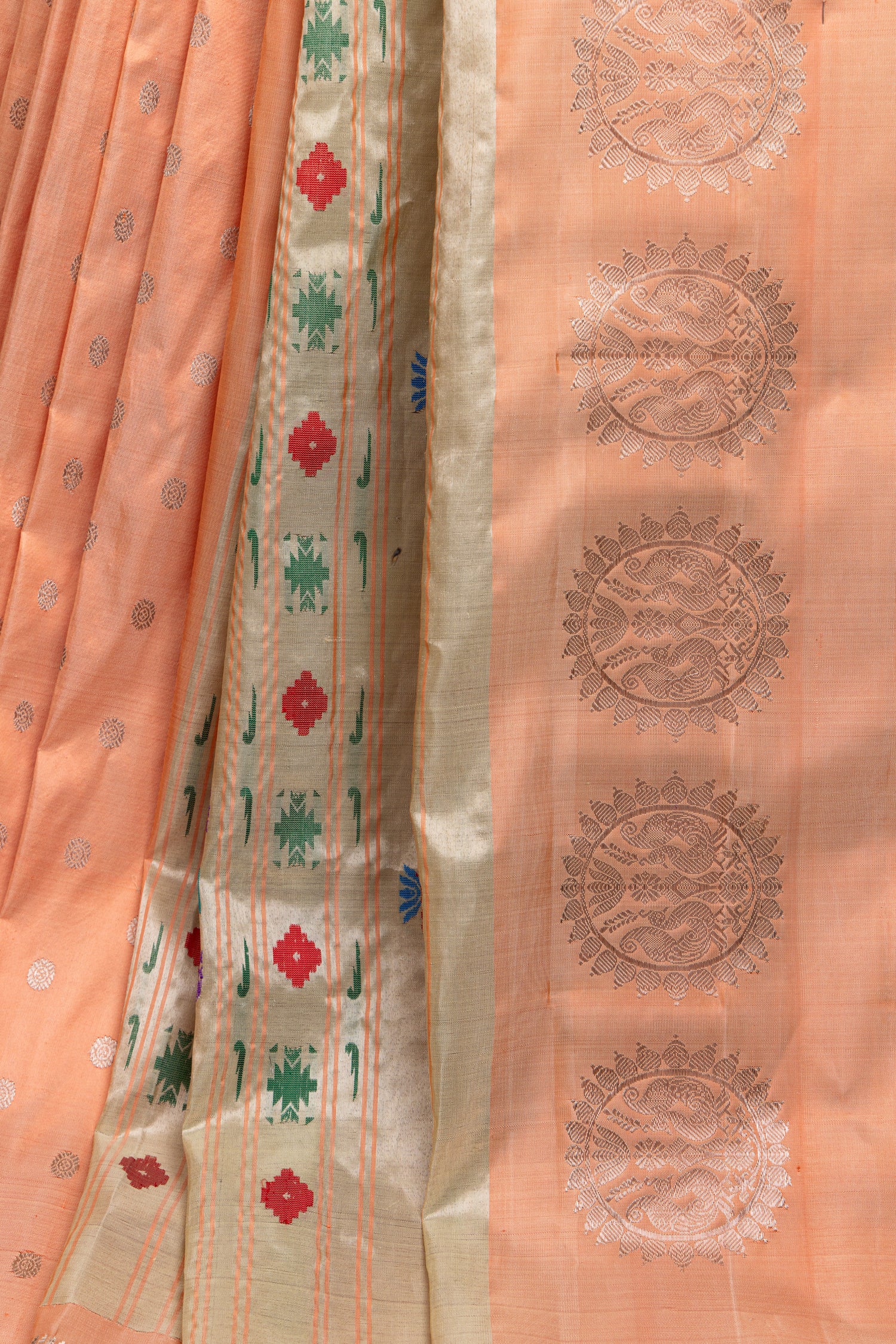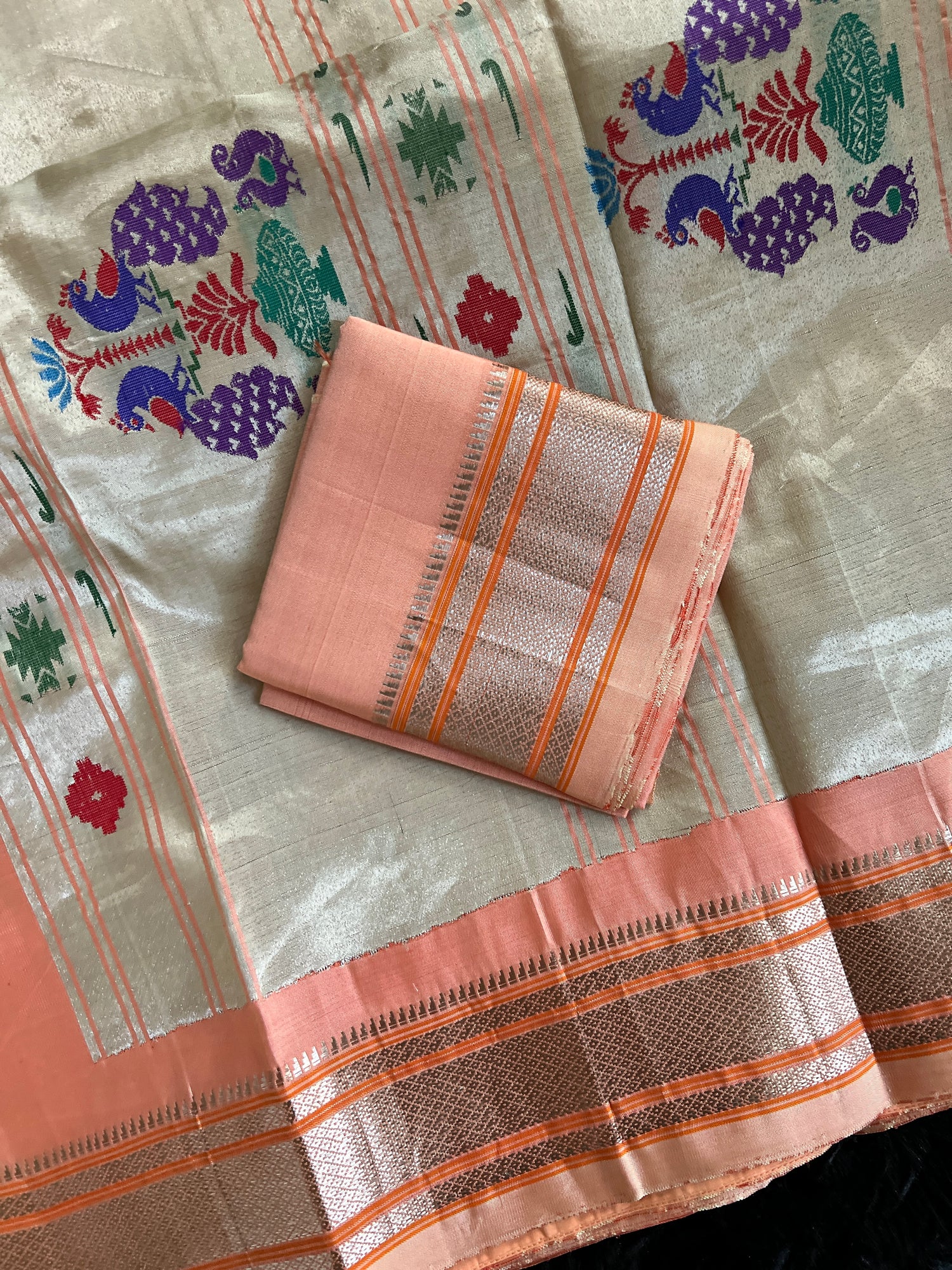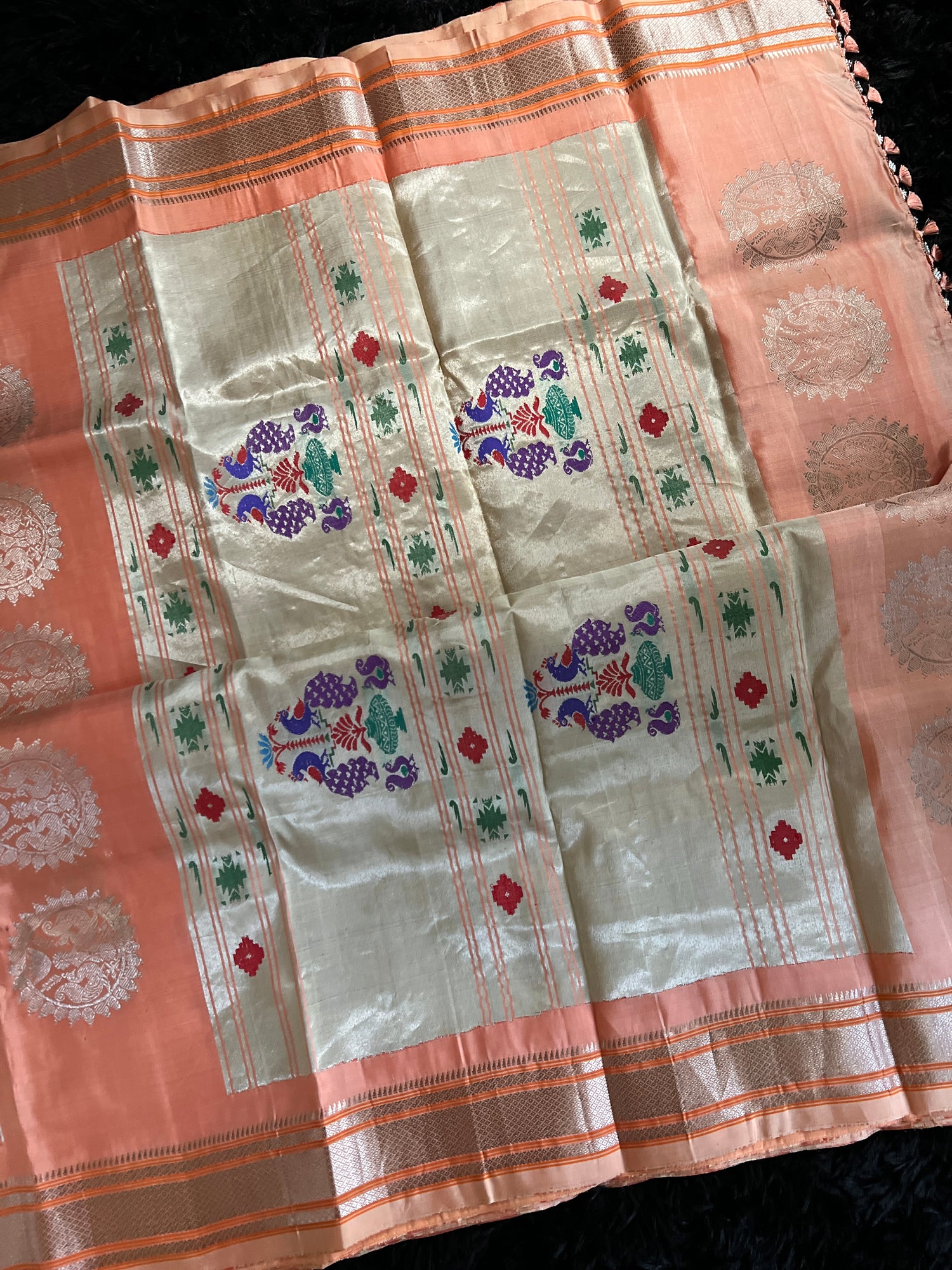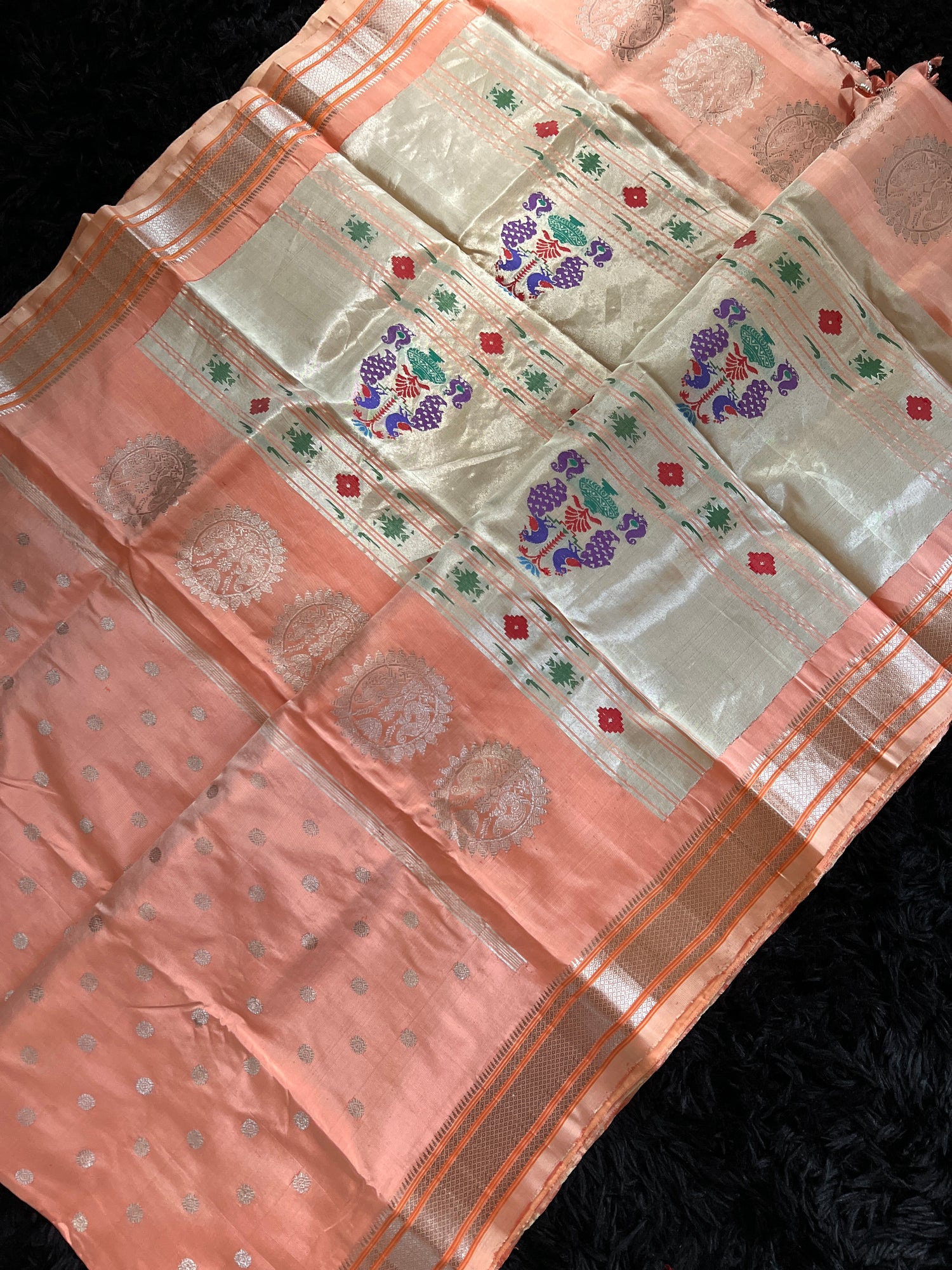Maharani Kalanjali Pastel shade (peach pink mix) Silver Zari Paithani Handloom Pure Silk