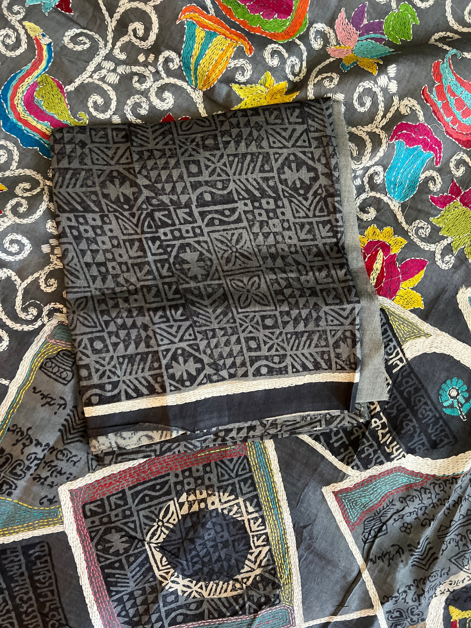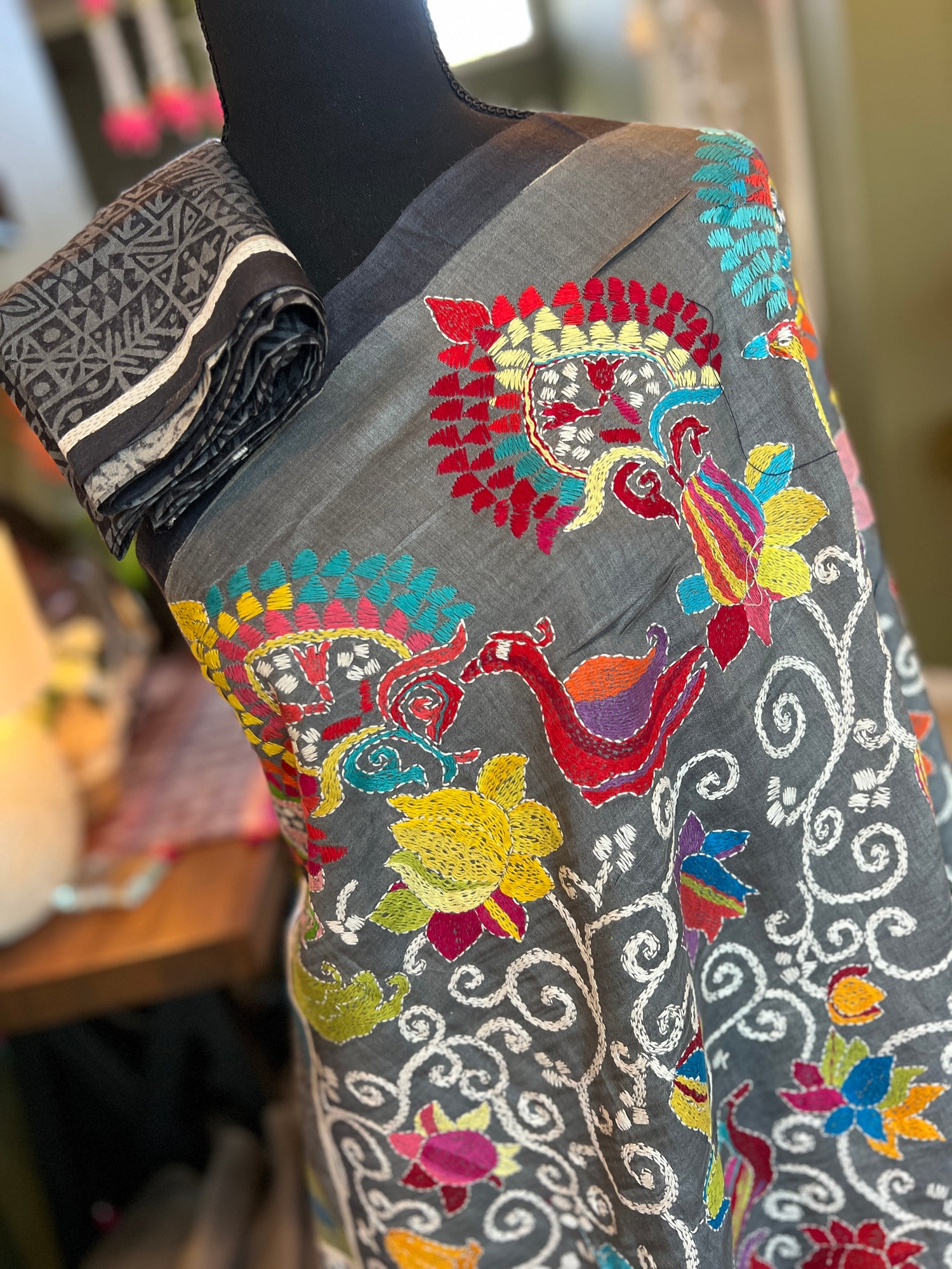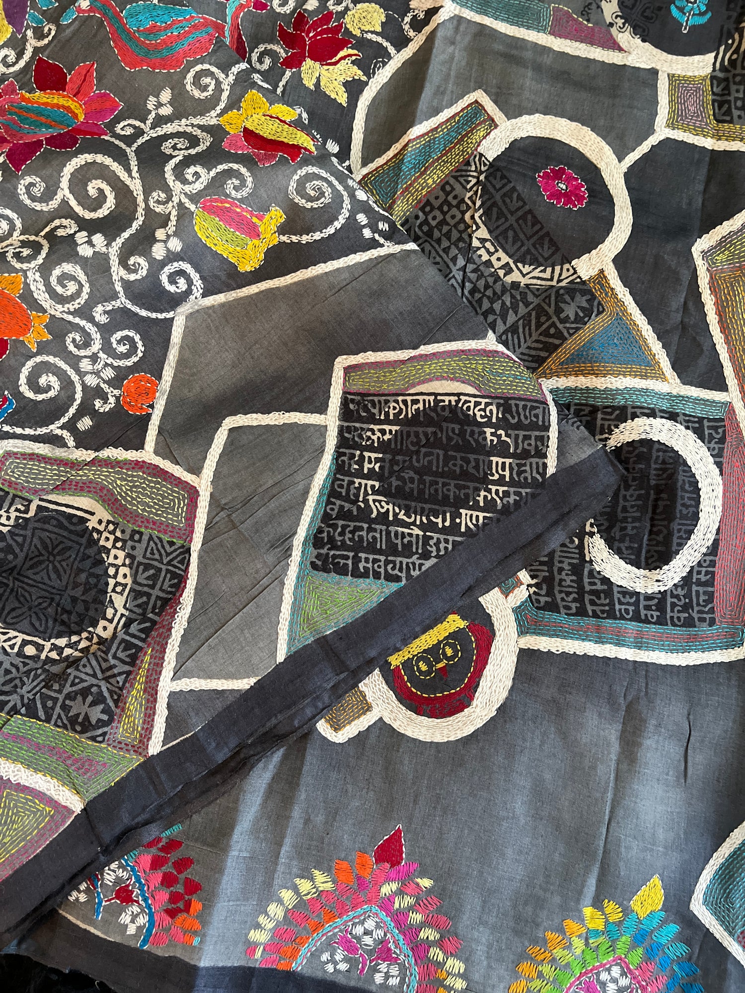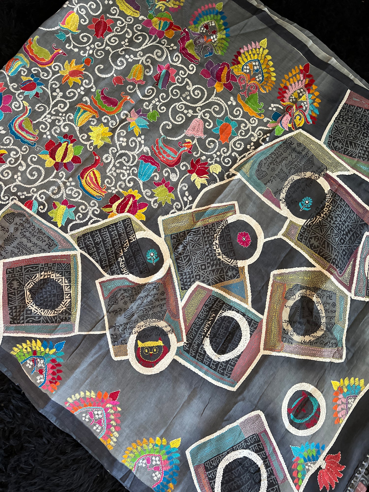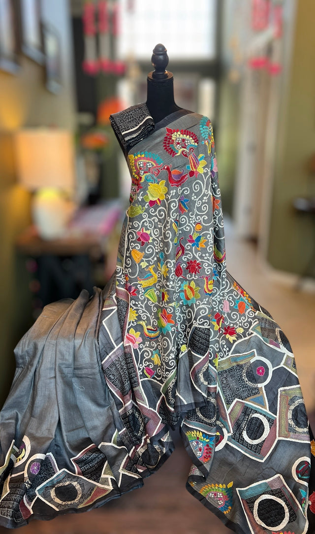 Grey HAND Kantha Stitch Gachi Tussar Silk